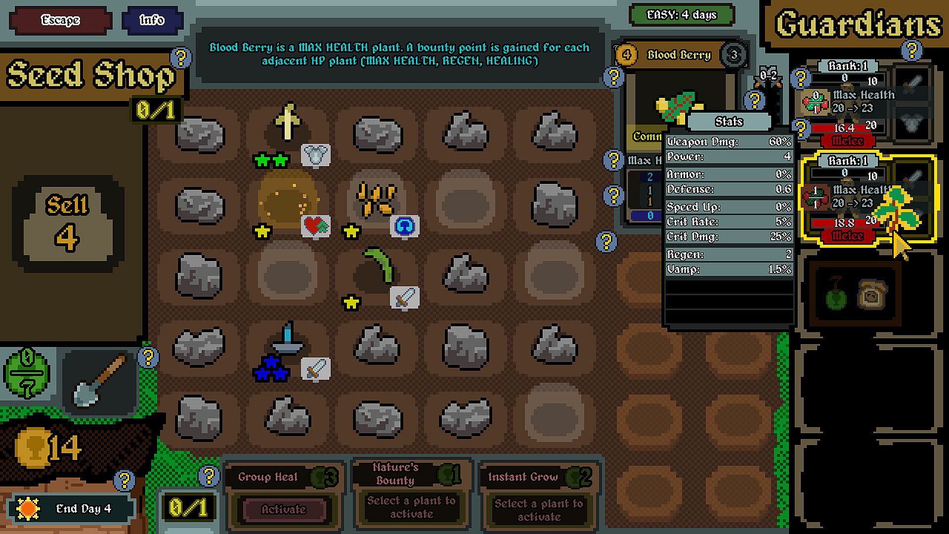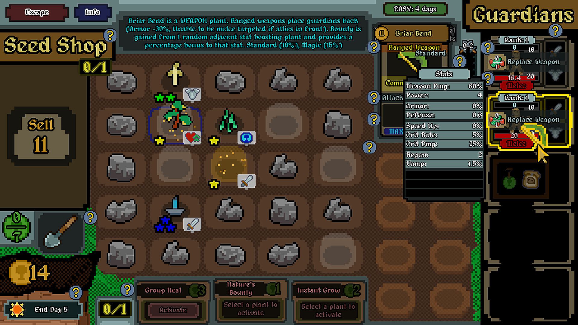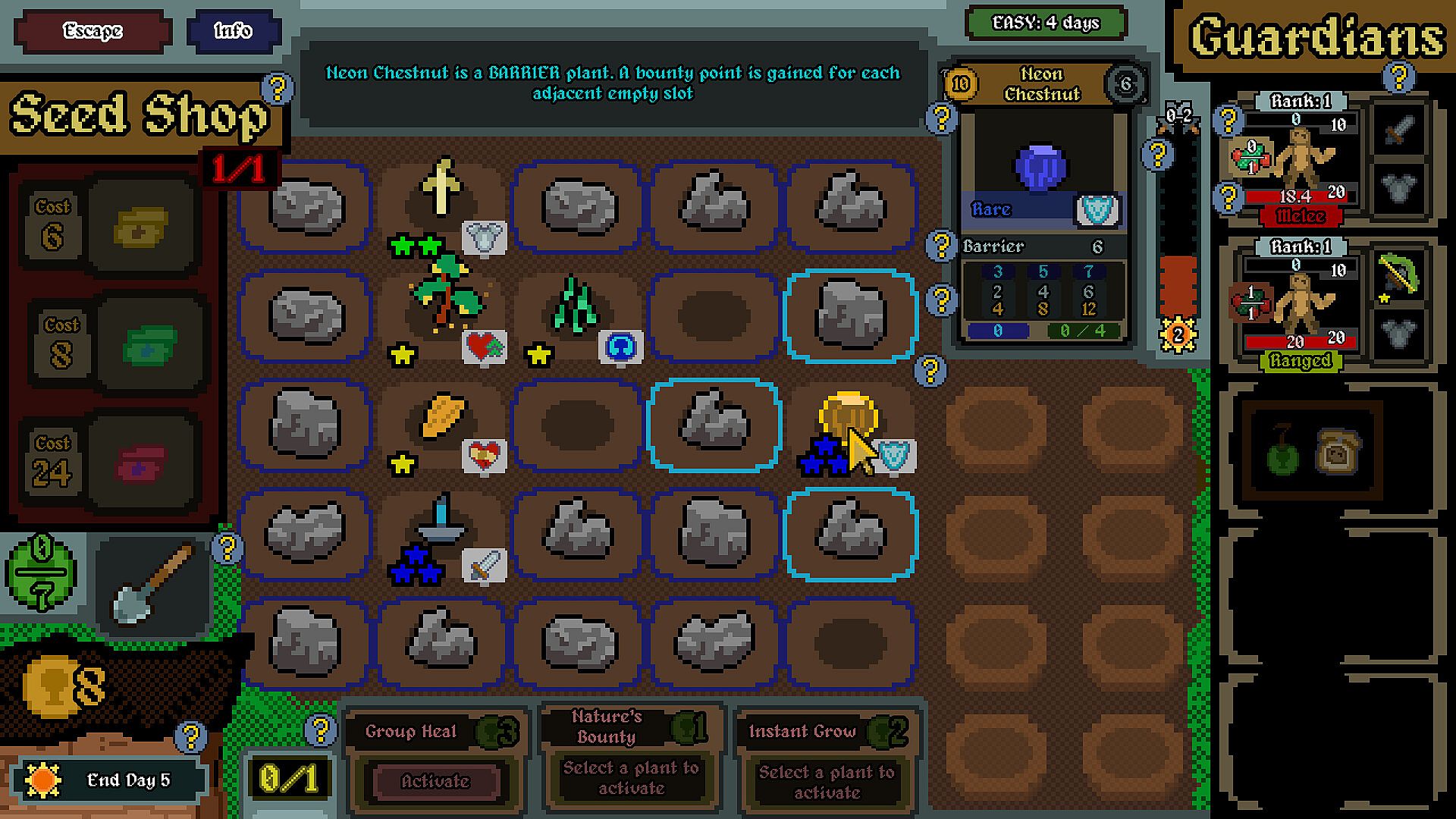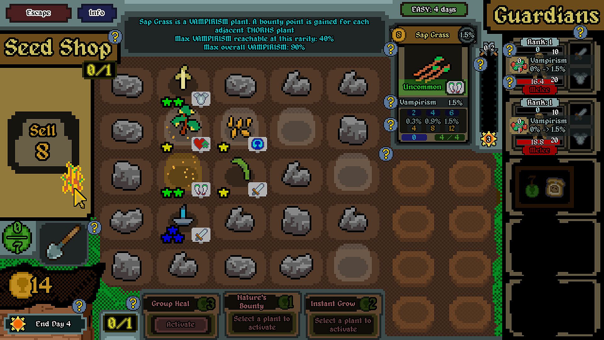 Throughout the game, the positioning of plants is important since most plants can earn bounty levels. These bounty levels are earned differently by different plants, but can provide strong boosts to the effects of most plants. Most plants earn their bounty points based on adjacency to other specific plant types.There are 3 different ways to use plants. Plants may be consumed by guardians, sold, or composted. While giving boosts to guardians is vital to beating encounters, selling or composting plants is also very important.