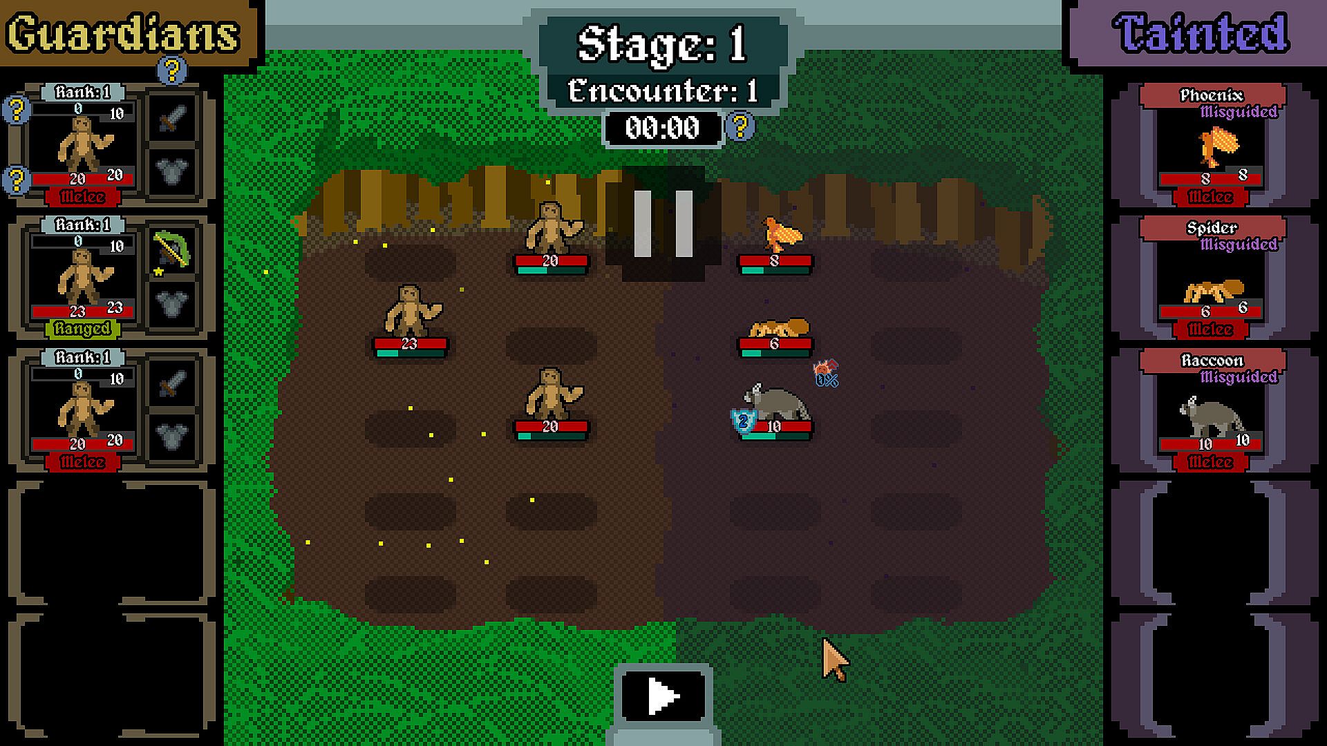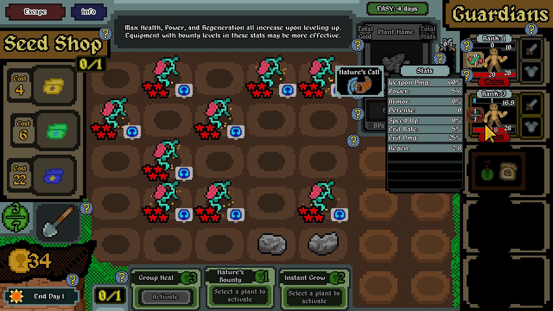 Grove Grown Guardians is a strategy game about growing plants and defending the grove from the threat of corruption. Periodically, creatures tainted by the corruption will attack the grove and the guardians will need to face them in auto-battling combat. In order for the grove to survive, resources and plants must be managed to provide guardians with the advantage they will need to win.