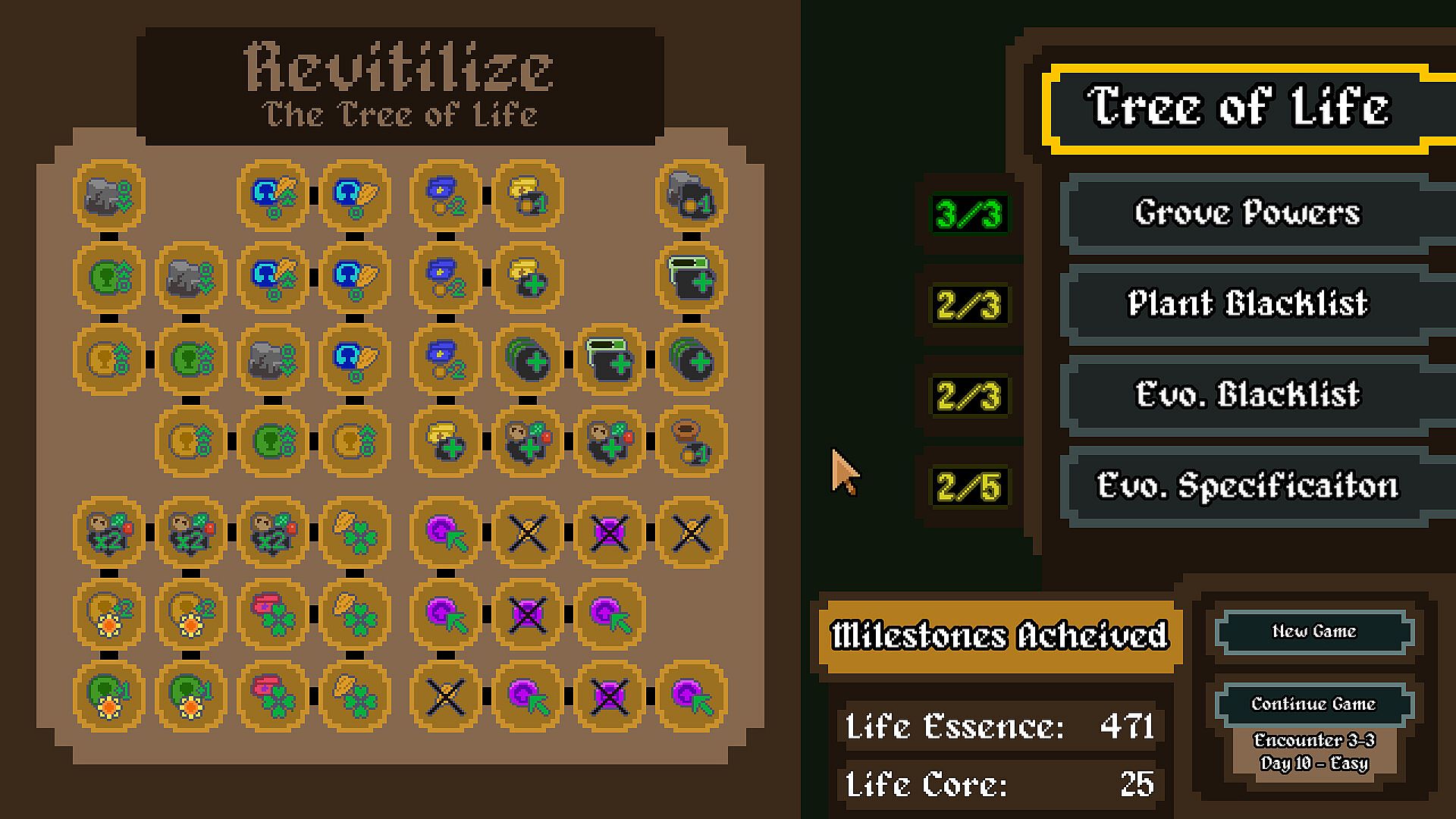 For each time an enemy encounter is defeated, special life resources are gained. These life resources can be spent at the Tree of Life to gain bonuses when starting a new game. Additionally, for each upgrade purchased, progress is earned towards unlocking new grove powers. Once all the powers have been unlocked, the final milestone to unlock will allow you to challenge the source of the corruption in future games.If interested in seeing more, follow the link to the YouTube channel for the developer game demonstration.