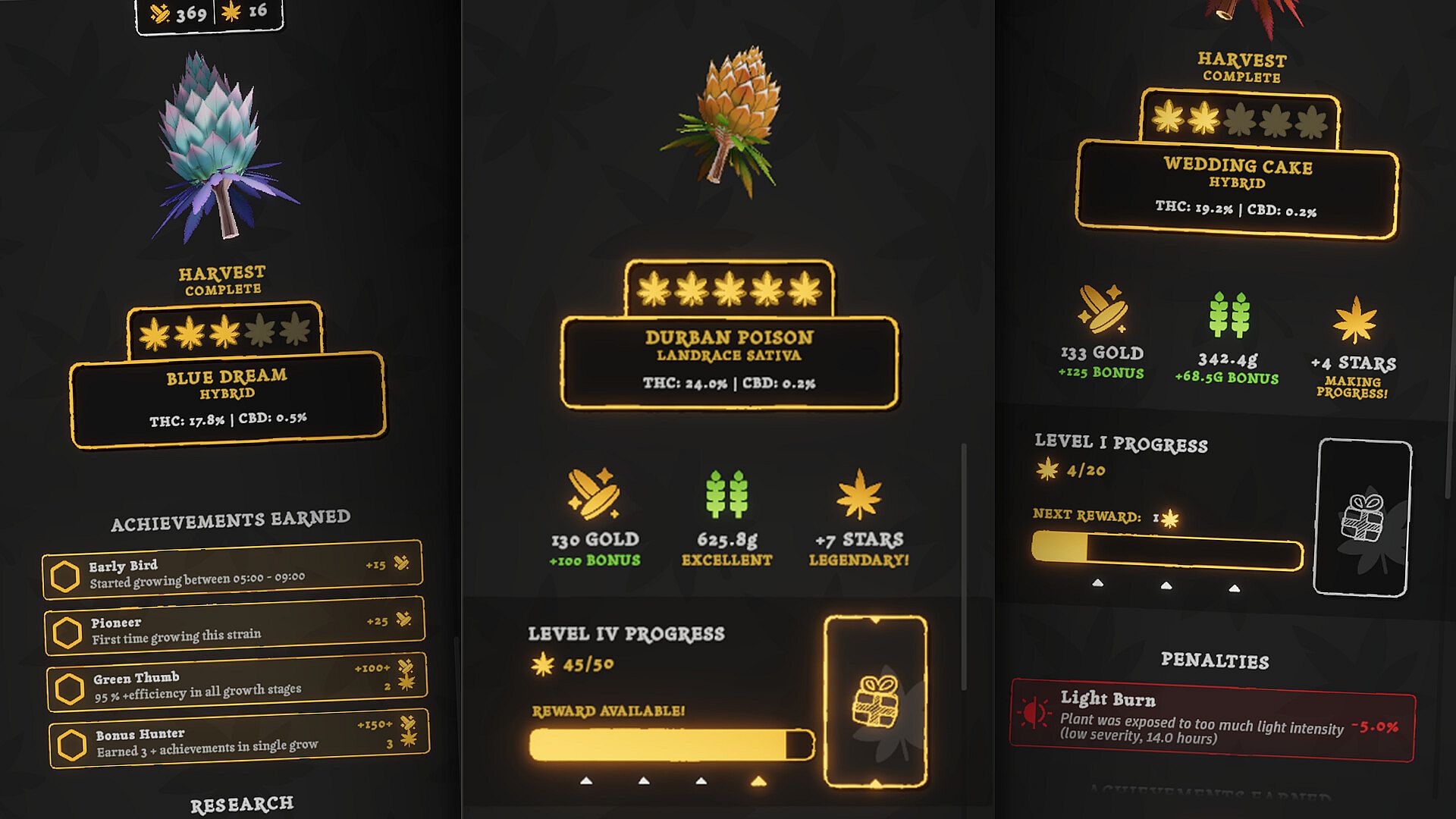 Plants progress through complete cycles - vegetative, pre-flowering, flowering, harvest, and recovery. Each stage presents random encounters that affect your outcomes. Level up individual strains through five mastery levels to unlock genetic research and produce perfect 6-star buds worthy of Golden Status.
