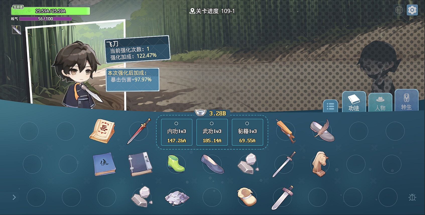 除了合成功法以外,玩家也可以选择修炼功法来无限强化。功法可以无限强化变得越来越强,并且后续途径上更高级的功法都可以享受到前置功法的强化!