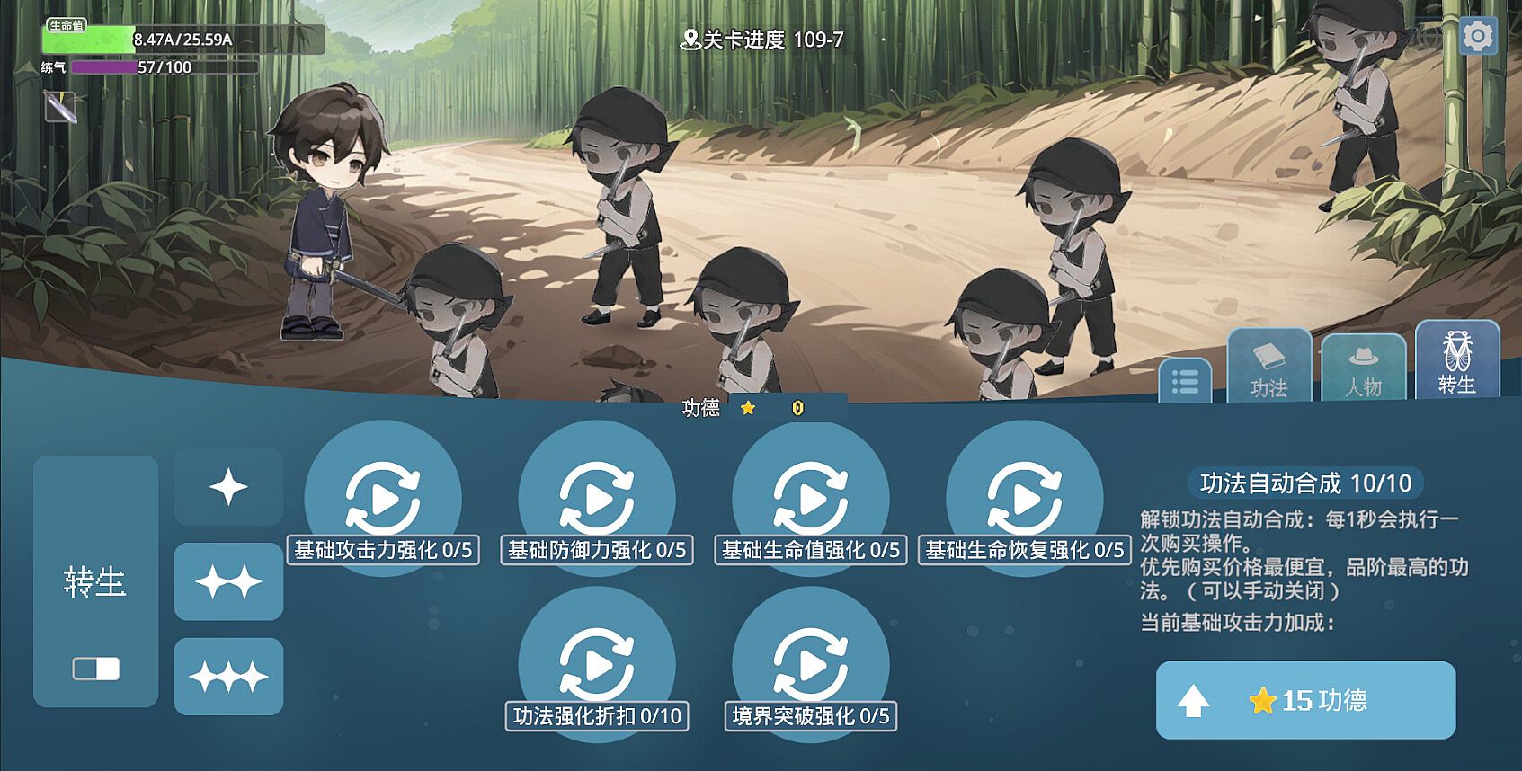通过积累功德强化自身各项能力,甚至可以拓展新的功能与机制,随着一世世的积累,玩家可以逐渐解放双手,更多的享受变强的无限乐趣。