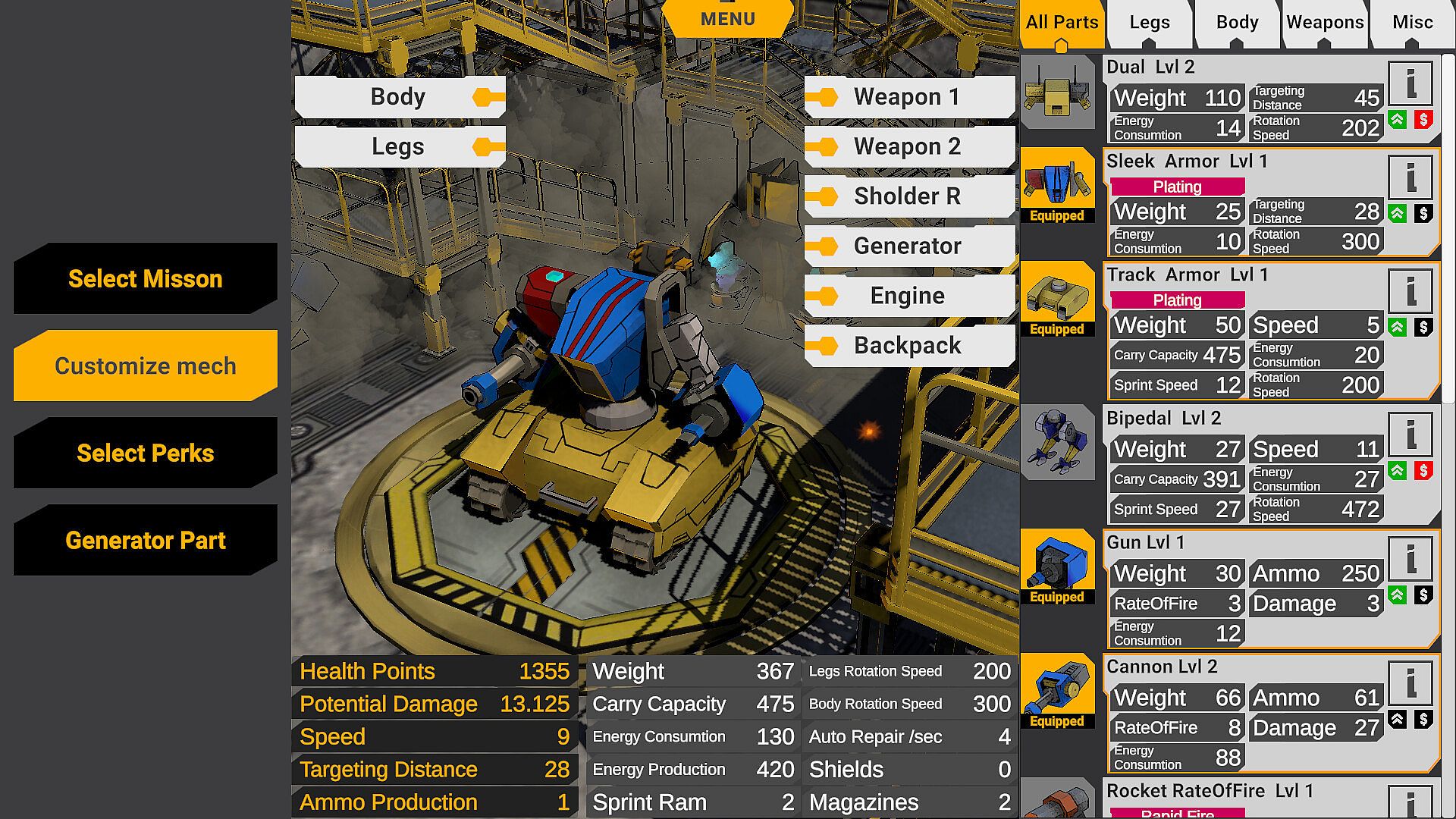 Customize your mech across every system, legs, body, engine, generator, weapons, and shoulder mounts, to define your own playstyle. Between runs, use resources earned from fallen enemies to unlock permanent global perks and upgrade your mech’s core components, expanding your tactical options for the next attempt.
