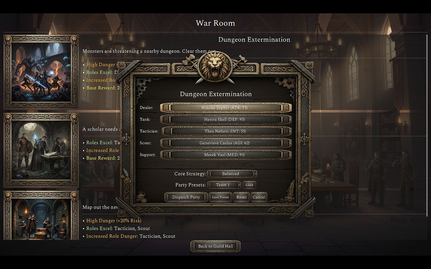• Scout and Recruit new adventurers from a pool of 30 candidates