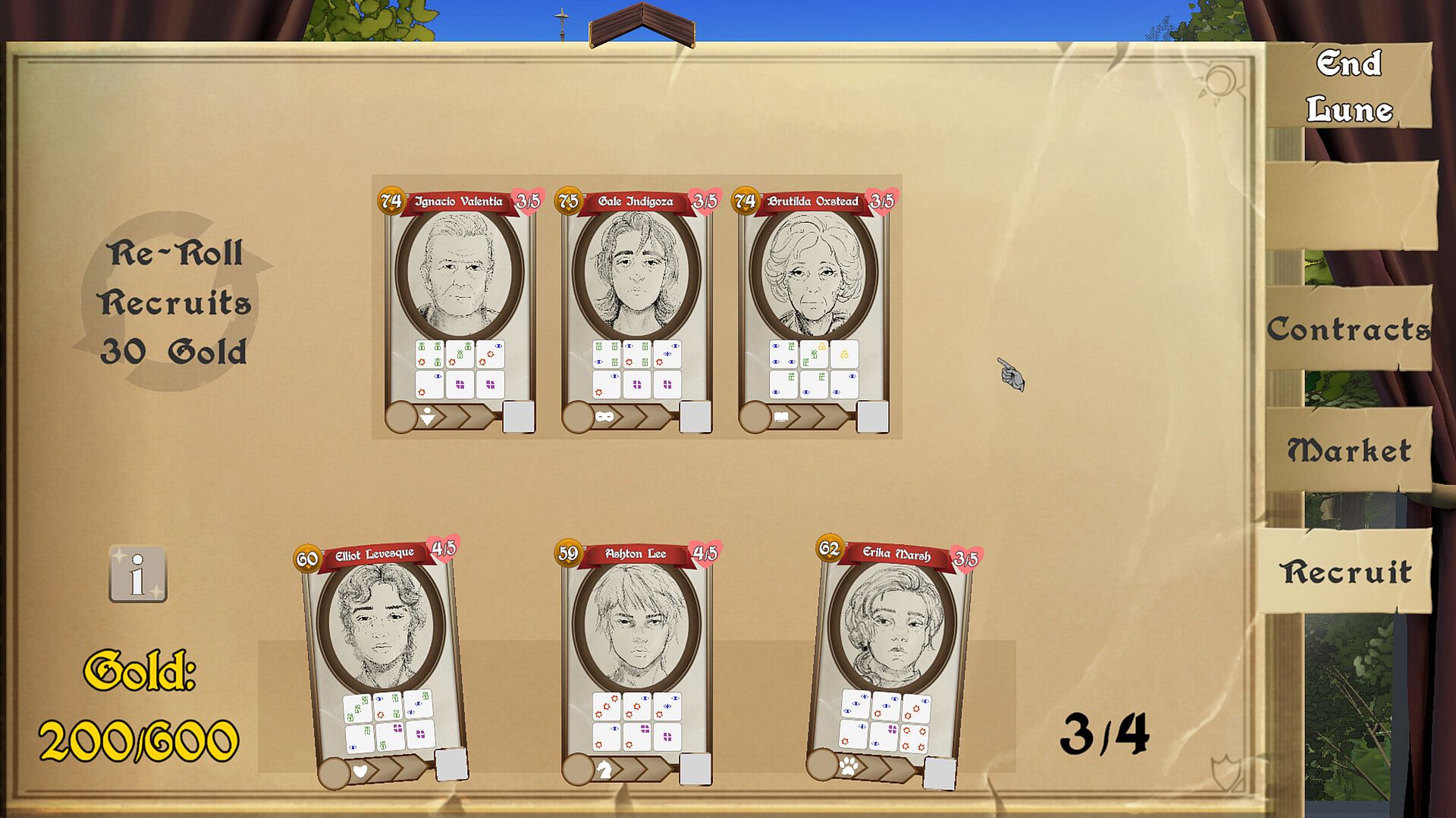 Each job you take requires you meet a different stat threshold. Using a discerning eye, assign the right members for the job and roll the dice (cross your fingers they don't mess it up, or worse, get injured.)