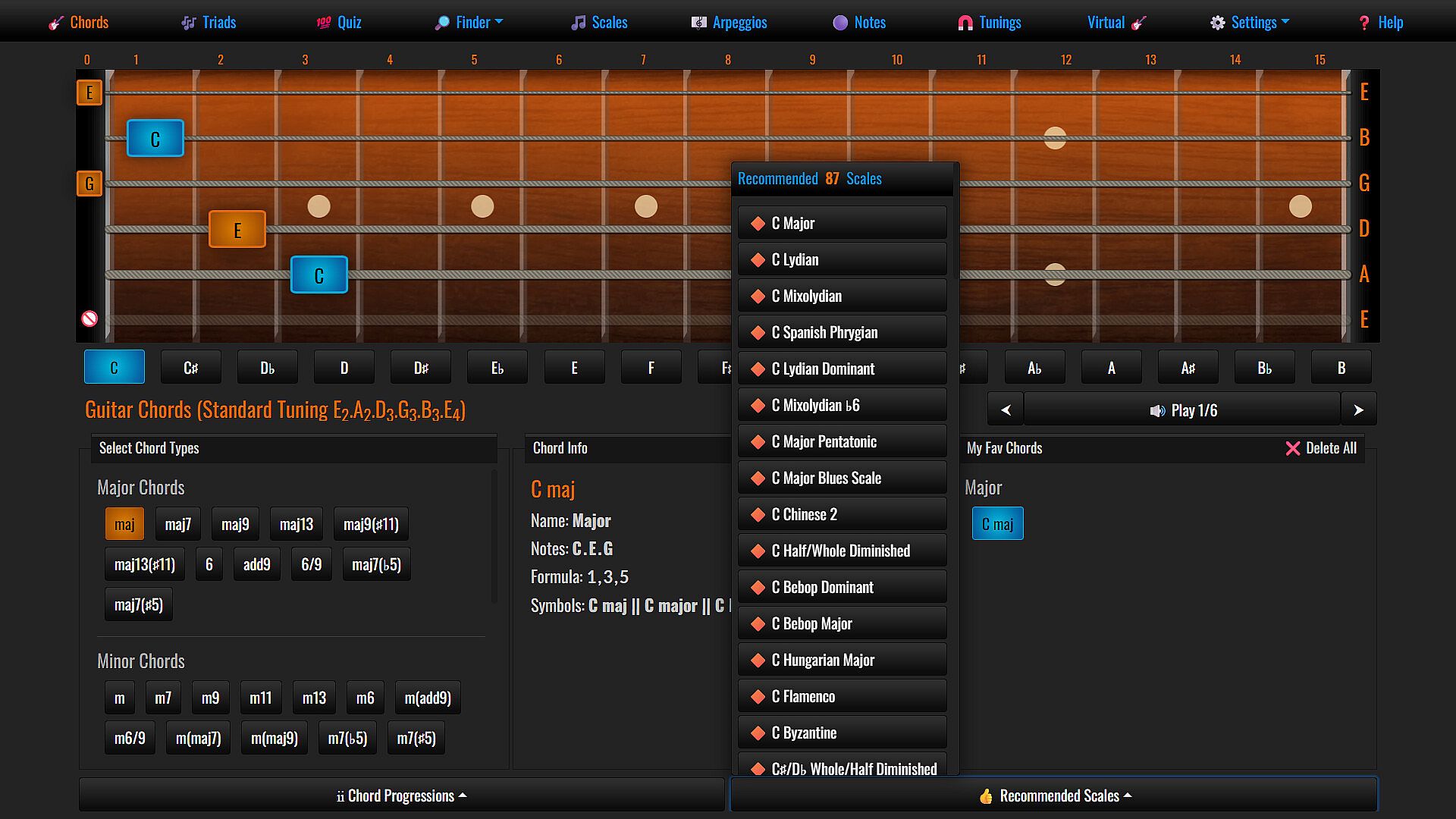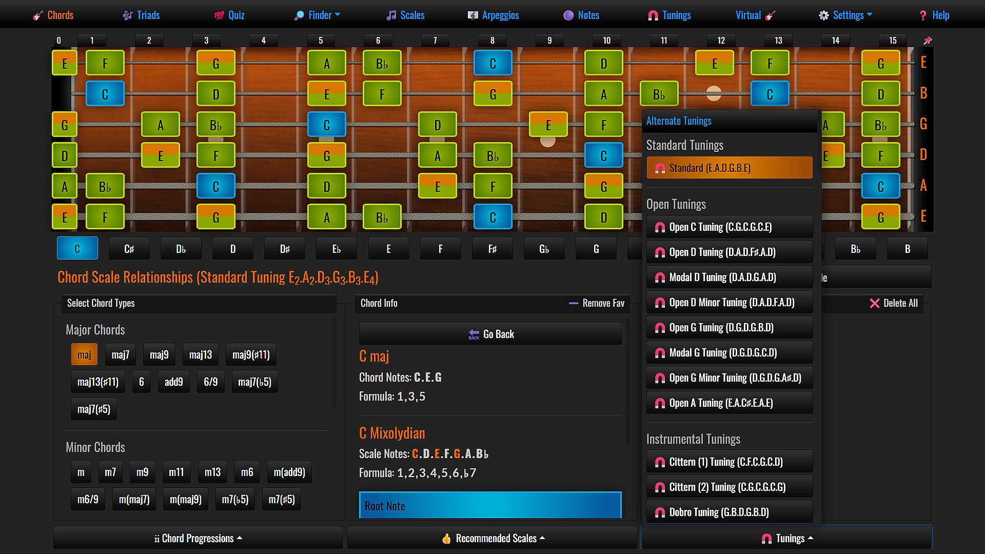 • Comprehensive Package: Elevate your guitar journey with an all-encompassing suite of tools and knowledge. Explore Guitar Chords, Chord Progressions, Scales, Triads, Arpeggios, Fretboard Note Mastery, Reverse Chord & Scale Finder, Chord Quizzes, Alternate Tunings, Guitar Tuner, Virtual Guitar and the intricate web of Chord-Scale Relationships.