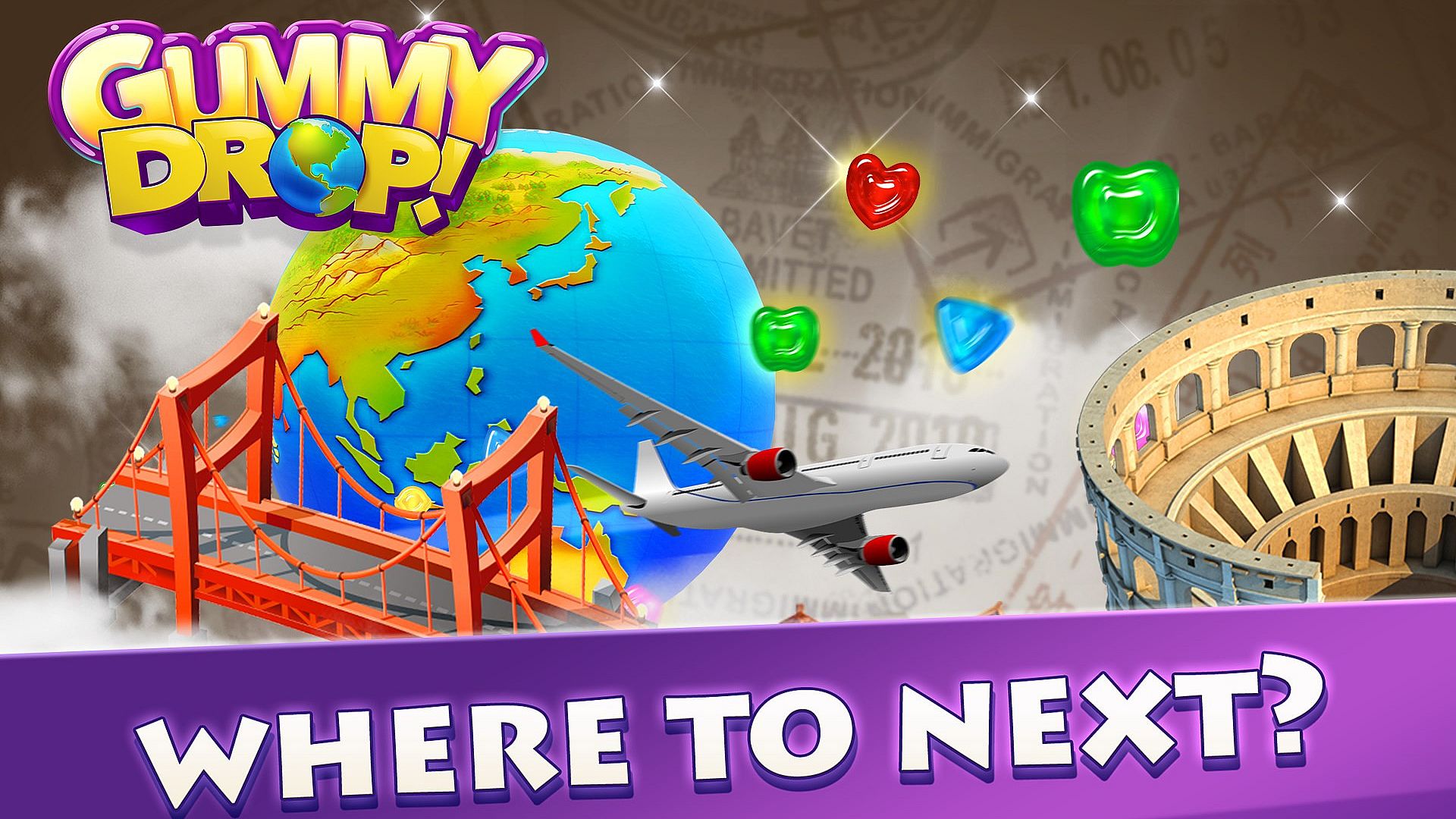 Gummy Drop! is the exciting Match 3 puzzle game where delightfully squishy gummies are swapped to help restore monuments and rebuild cities around the globe! Pack your bags and grab your passport, we’re headed on a grand adventure! Be the traveler and the tour guide, completing puzzles to rebuild and restore thousands of monuments. Restore famous landmarks in iconic cities like New York, Sydney, Tokyo, Paris, London, Rome, Berlin, New Orleans, and Barcelona. Meet the locals and see the sights, from the Eiffel Tower to the Statue of Liberty and more! TRAVEL WHERE YOU WANT, WHEN YOU WANT! In Gummy Drop! you get to match and build in the city of your choice whenever you want. Visit Rome for the weekend, jet off to Tokyo for some sushi, or have coffee in Paris! With Gummy Drop! you can swap and match to travel the world with just a tap of your finger. SPECIAL EVENTS! Journey to new and exciting, limited time only special destinations for every season. We’ve traveled to the Garden Gala for Mother’s Day, the North Pole for the Holidays, and even Transylvania for Halloween. Who knows where you’ll go next? It’s time to get out there, start matching, and restore the world one gummy at a time! Support: Need a little assistance? We’re here to help! https://gummydrop.zendesk.com