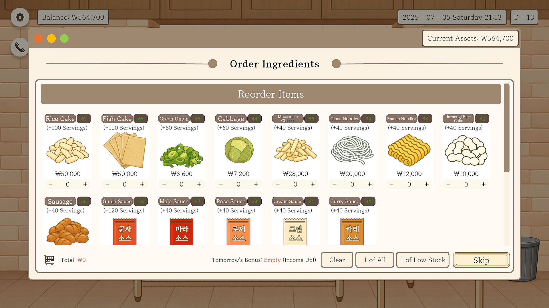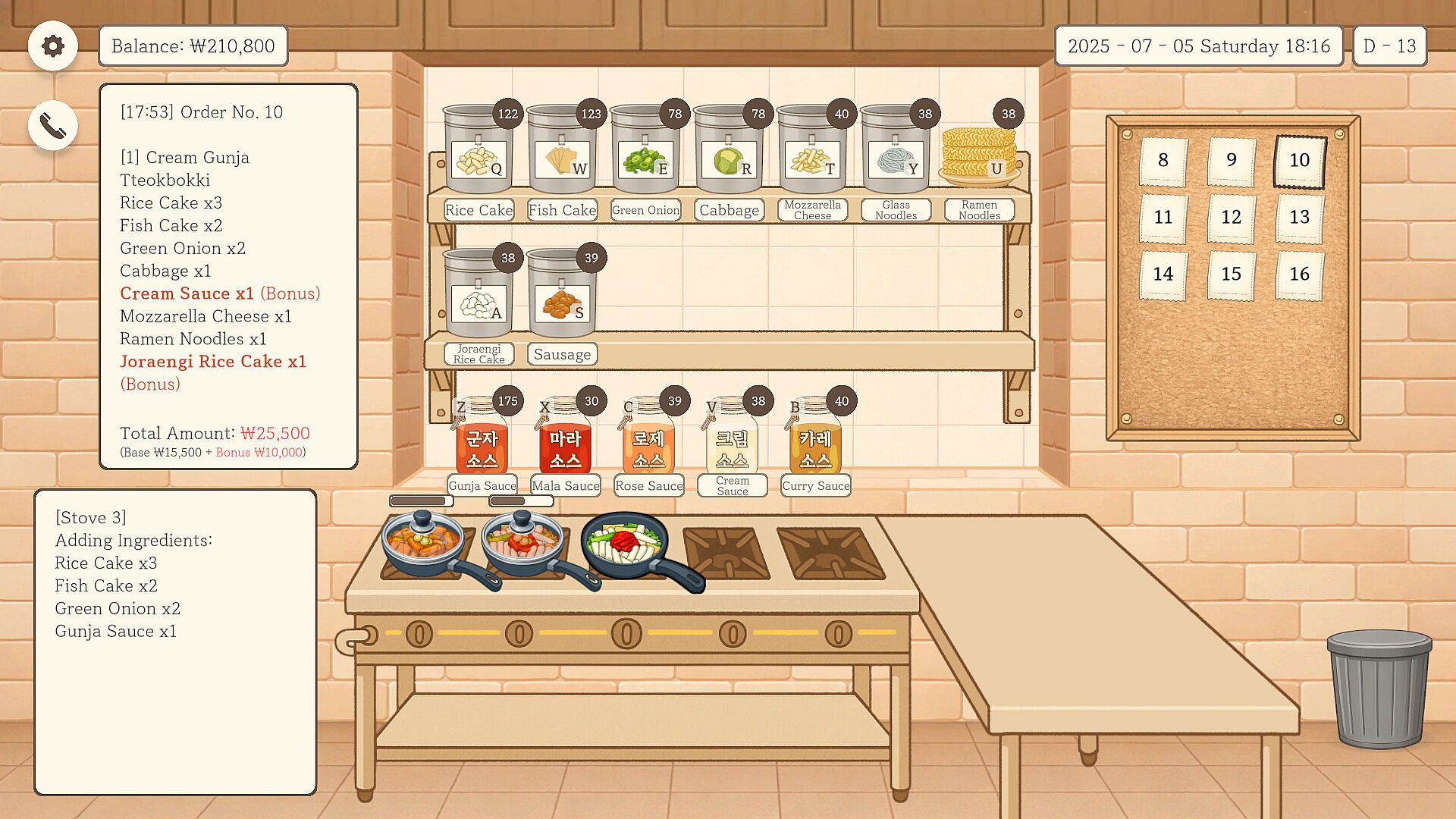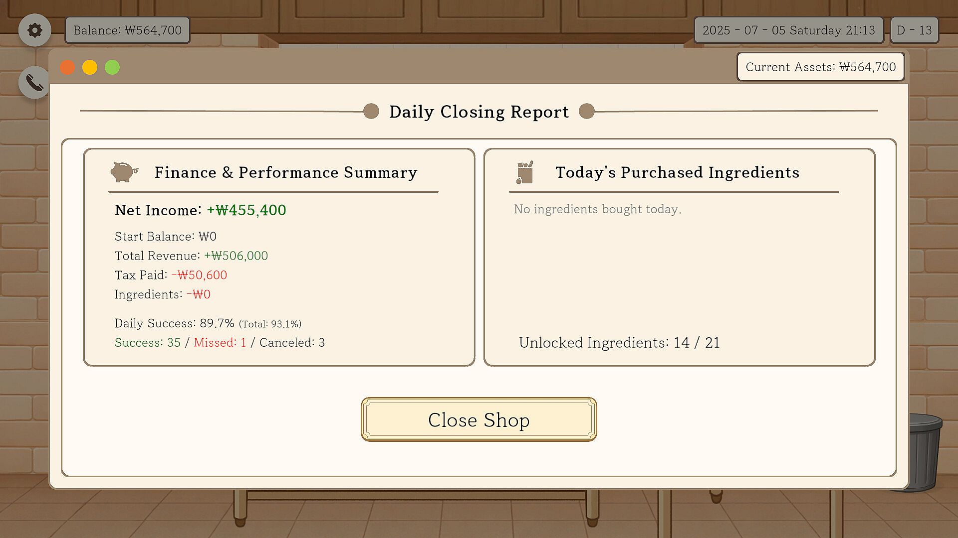 • After the final tally on Day 14, your ending depends on Baepsae's total earnings, order success rate, and the number of ingredients you've unlocked. Watch out — if your sales are too low early on, you might face a dreaded early termination!