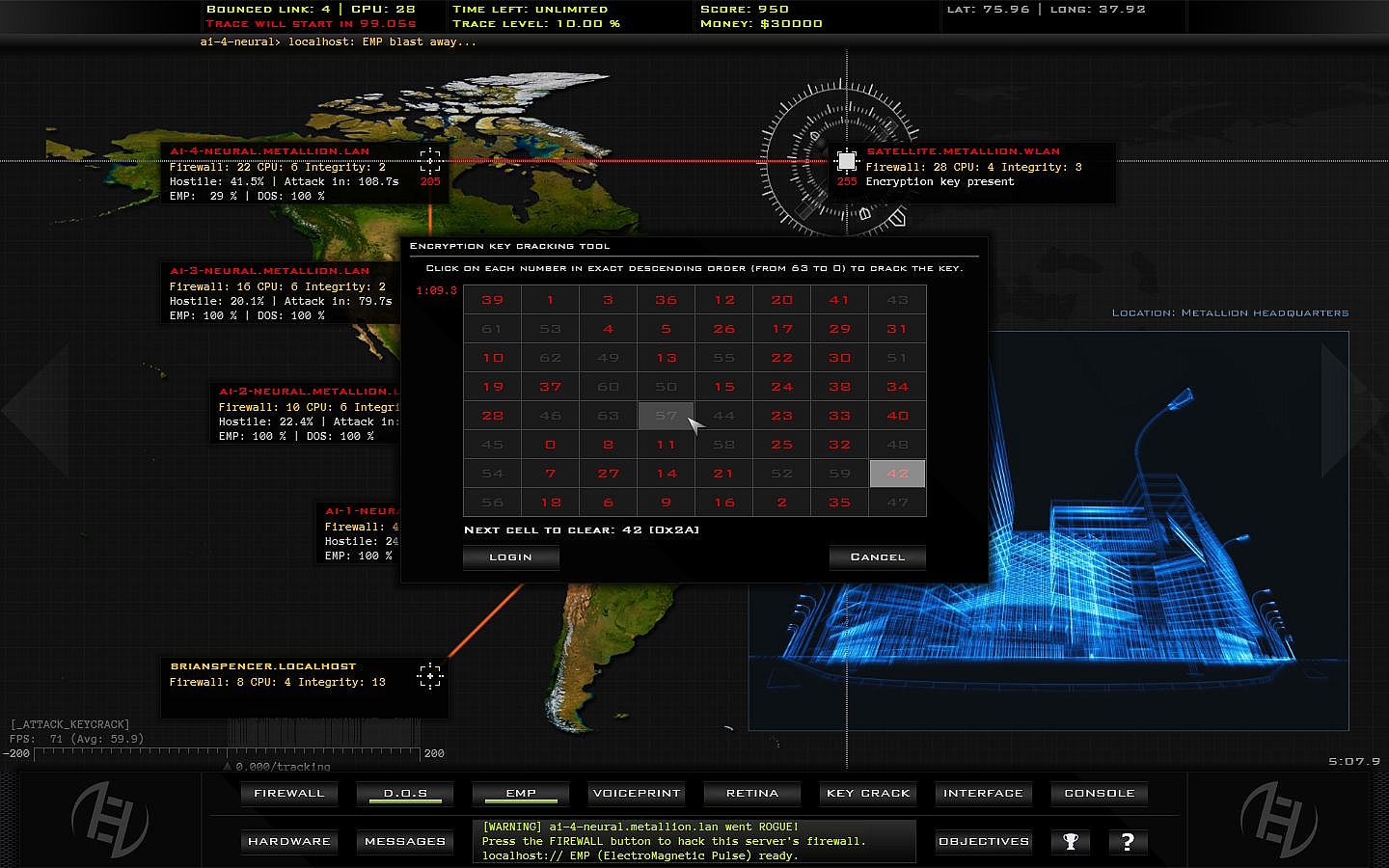 You have to hack into computers using various tools, from a basic firewall cracker, to sophisticated voice print authentication systems. Steal money to finance your objectives, buy hardware upgrades or bribe off other hackers that are present in the game. Go as far as bypassing complex security systems to make your way into buildings and steal data. Frame people or even murder them using ingenious traps.