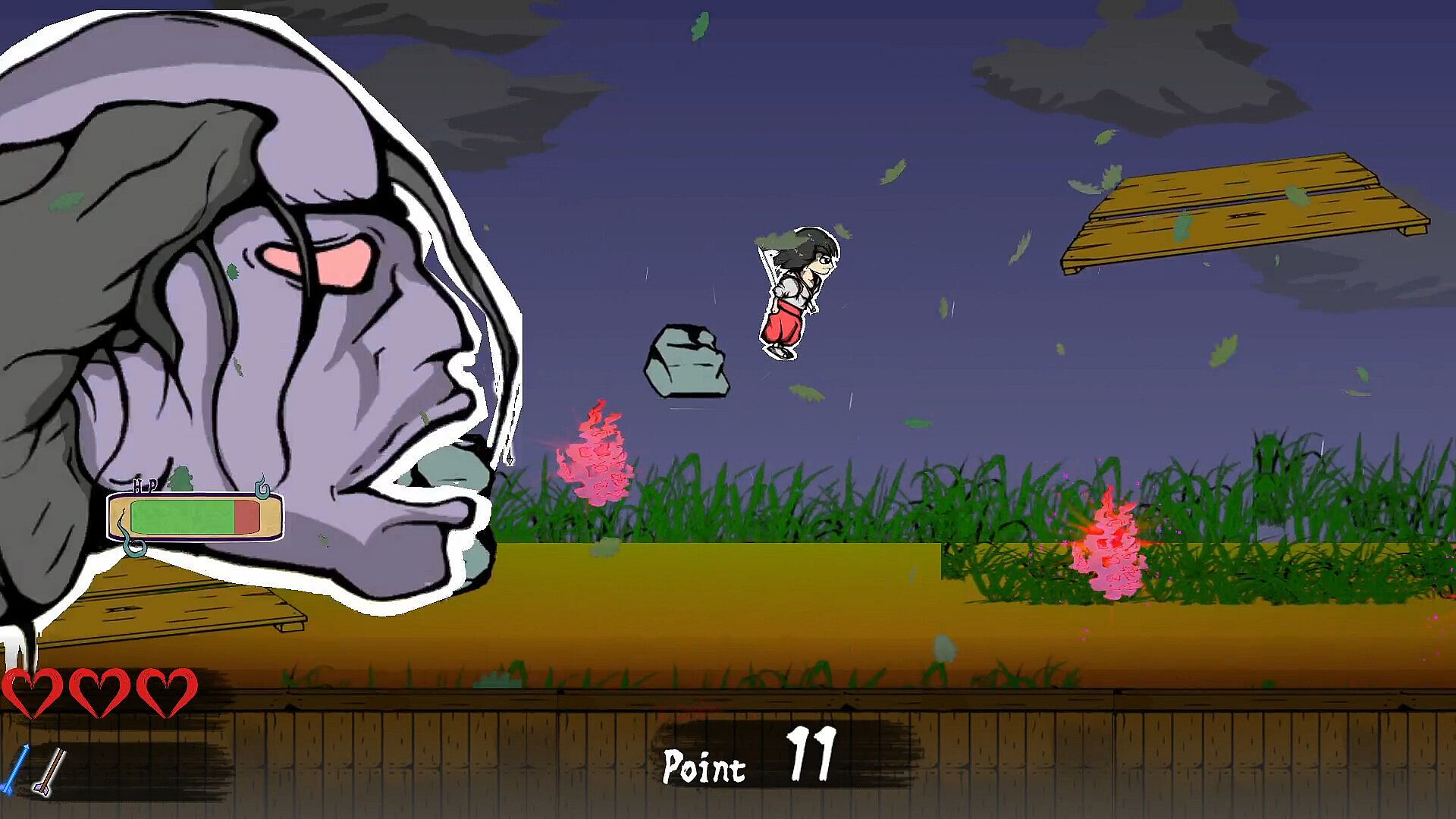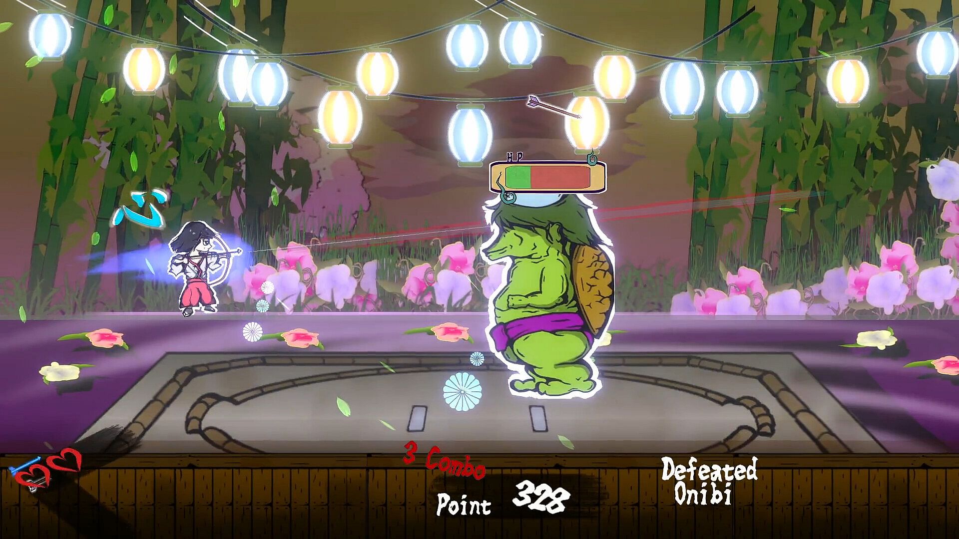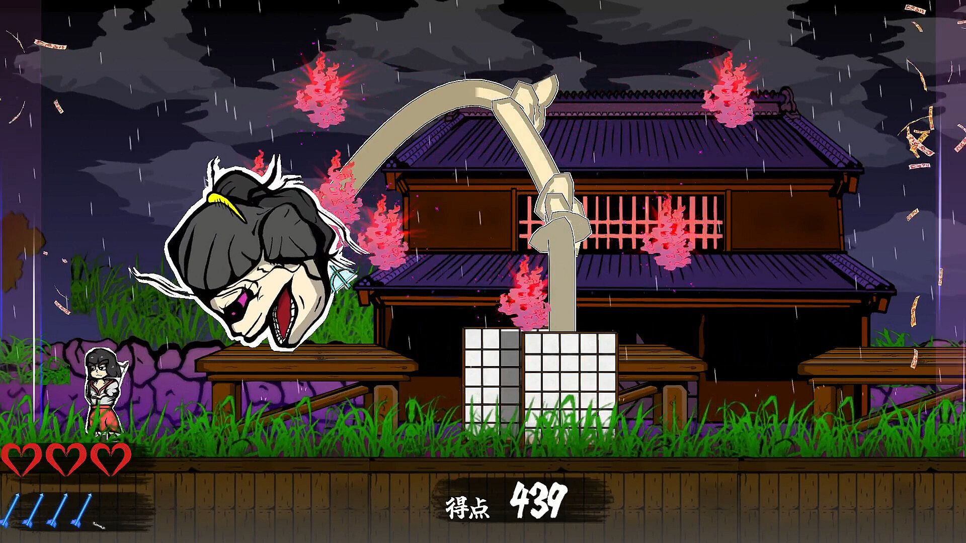 This is a side-scrolling twin-stick shooting game. Jump nimbly across platforms to avoid enemies and shoot in full 360-degrees with your spirit arrows. While aiming, the game will slow down to allow you to line up your shot before letting it fly. Use your quick movements and precise shooting to defeat yokai and save the day!