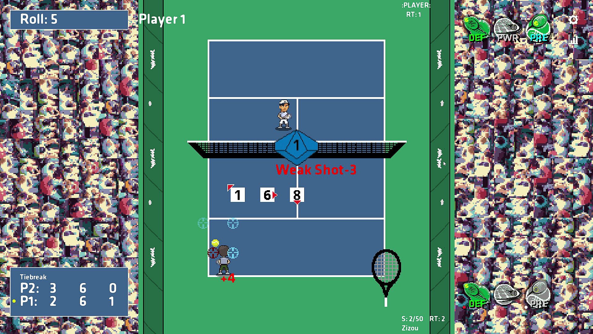 Simple right? Make no mistake though - behind the simplicity of the game system lies a highly dynamic tennis experience that mimics the "feel" of real tennis surprisingly well! Since the quality of your stroke (aka, your dice roll + skills) and the location of your shot (aka, how far the opposing player has to run to get to the ball) directly influence the opponent's chances of returning the ball successfully, the constant tug of war for the upper hand that is part of a real tennis match is simulated surprisingly well.