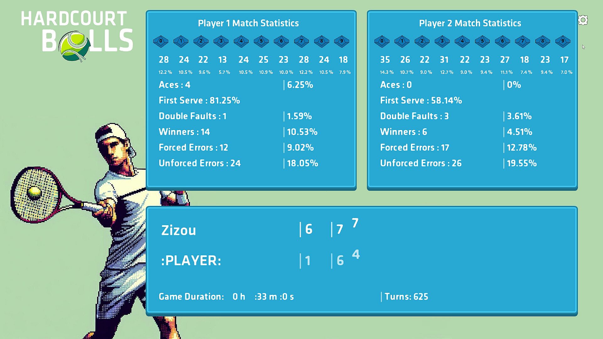 Hear me out. Most tennis games out there, while fun, often just boil down to gamepad acrobatics - who can press button combos faster and better wins. Playing them has always left me unsatisfied and longing for "more tennis". That's why I developed Hardcourt Balls with the goal to recreate, in a deceivingly straightforward way, the TACTICAL aspect of REAL tennis.