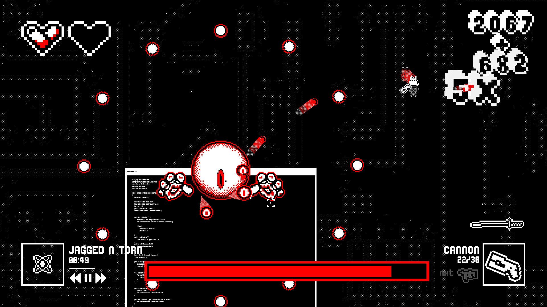 Fight hordes of enemies and bosses while blasting metal, breakcore and hardcore infused original music that takes the experience to the next level. Beat your highscore. Finish in your best time.