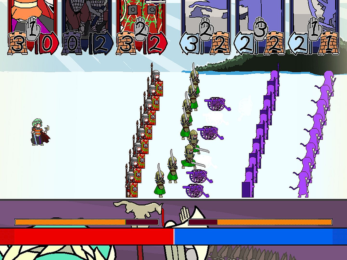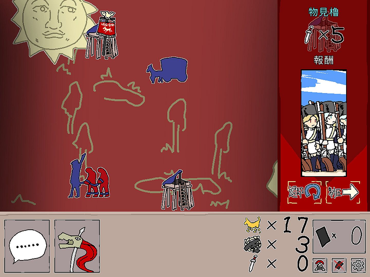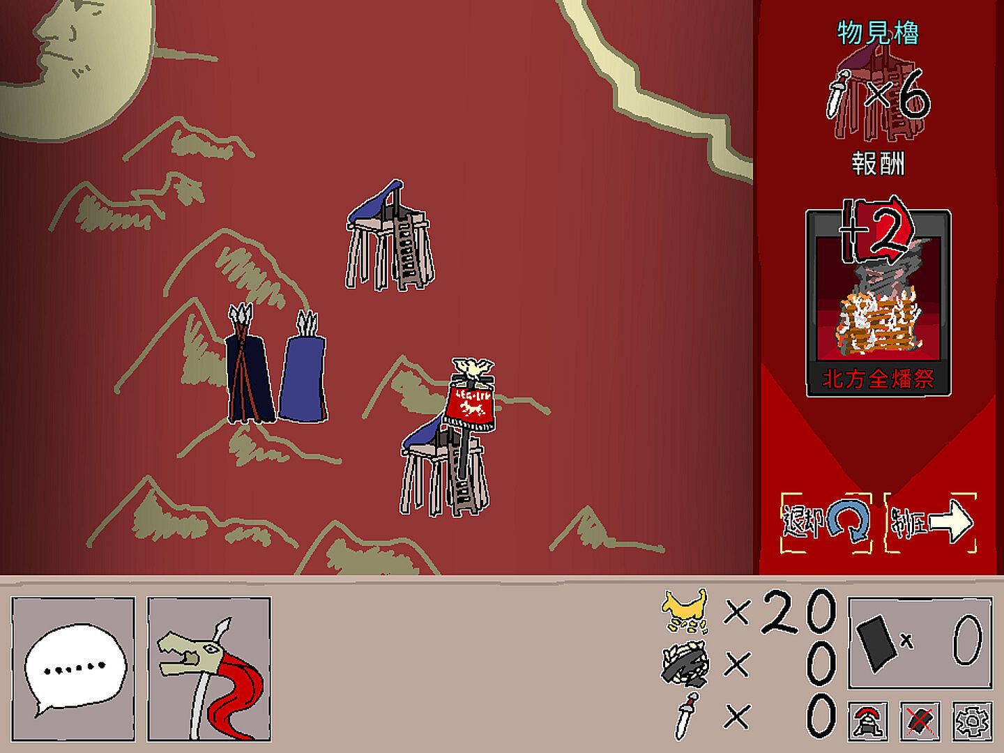 ポンコツになってしまったカペナ軍団長の指揮能力は複数の「指揮カード」で構成されたデッキによって表現され、戦闘での勝利により新しい「指揮カード」を得ます。敗走しても大丈夫。手札の不要なカードを破棄できる「教訓」を得てより強力なデッキを構築する布石に出来ます。ただし「継戦能力」が完全に失われるほど敗北を重ねてしまうと、残念、カペナ軍団長は将兵に見放されて今度こそ完全に第LIV軍団は失われてしまいます……。