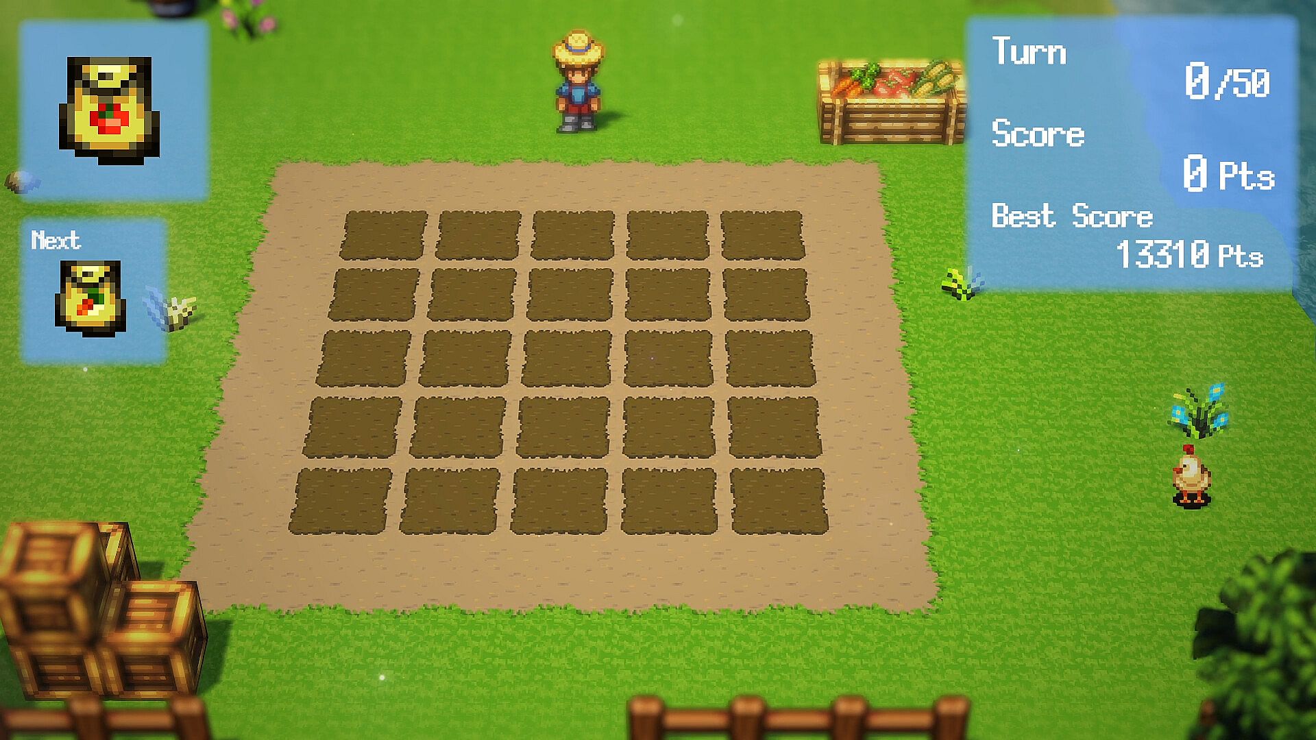 If the same type of vegetable or fruit is lined up horizontally, vertically, or diagonally, the score obtained when harvesting will be increased.