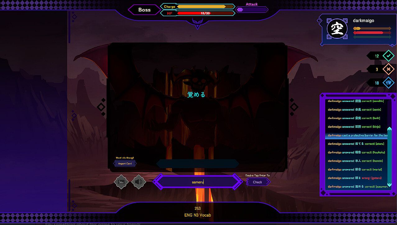You and your friends can play together in a Japanese boss mini-game where correct answers deal damage to the boss. The system reinforces your vocabulary through active recall, and mistakes are treated as learning opportunities to help you improve over time.
