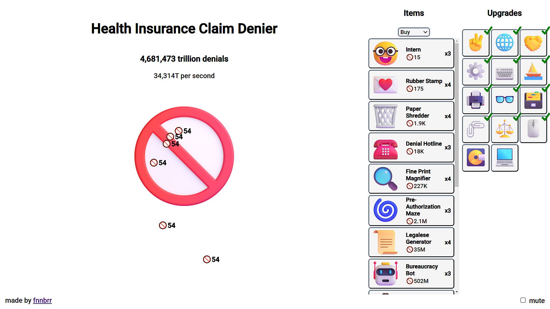 Health Insurance Claim Denier is a satirical incremental/idle/clicker game where you take on the role of a claim reviewer operating with absurd efficiency. Start out manually clicking the denial button to reject claims, then upgrade your operation to include items which automatically deny claims and upgrades which boost your stats. Your productivity will increase exponentially, leading to trillions of claims denied as you dominate the industry!