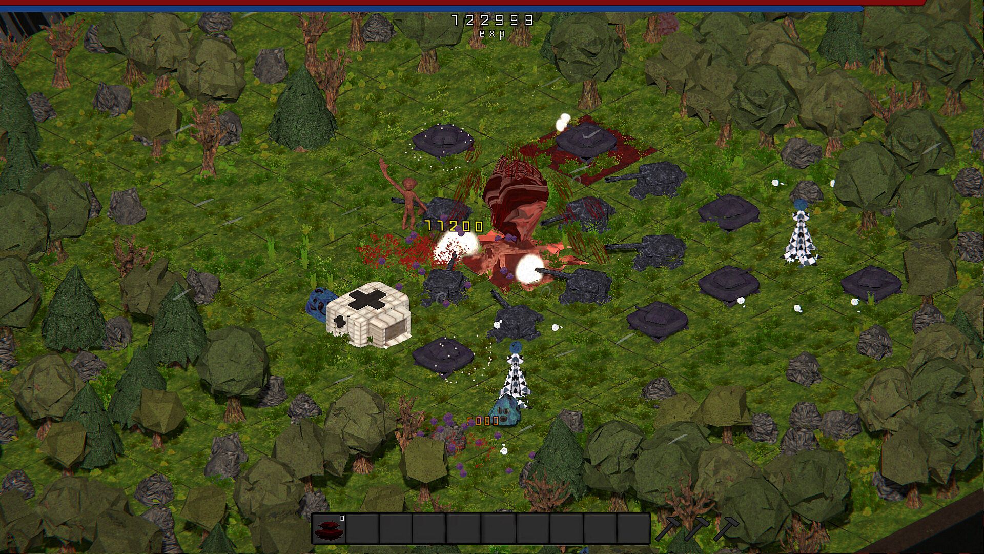 • To protect yourself, you will strategically build powerful defenses, including turrets and various structures. These essential tools can be unlocked by leveling up or collecting resources scattered throughout the map. Choose from an arsenal of unique weapons, each designed with special abilities and tailored to different strategies. But be careful: one wrong move can lead to your quick death.