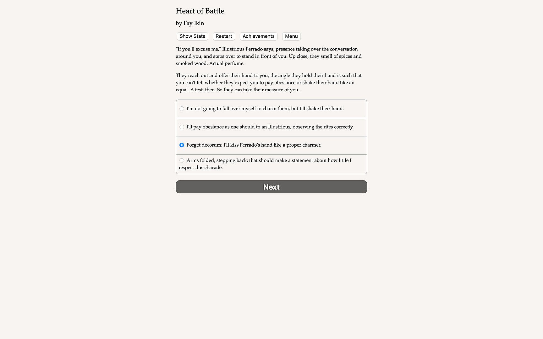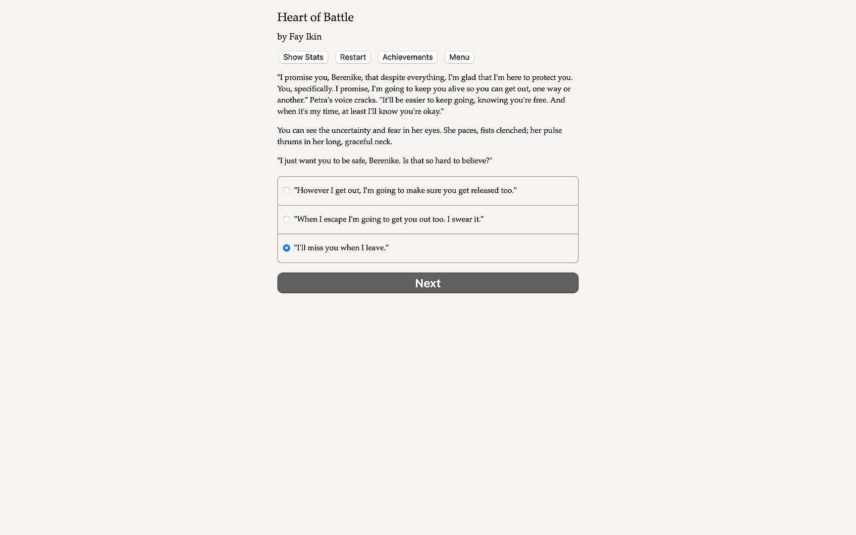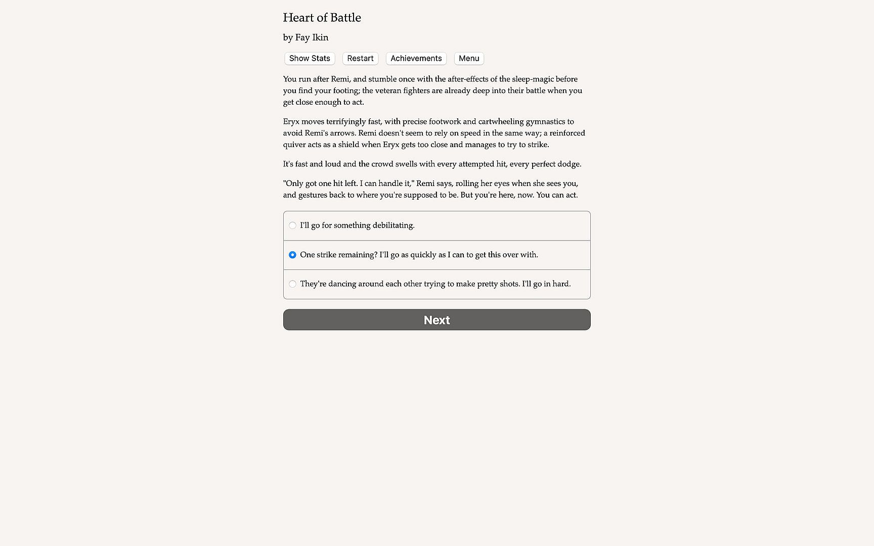 Heart of Battle is a 220,000-word interactive gladiator romance by Fay Ikin, where your choices control the story. It's entirely text-based—without graphics or sound effects—and fueled by the vast, unstoppable power of your imagination.