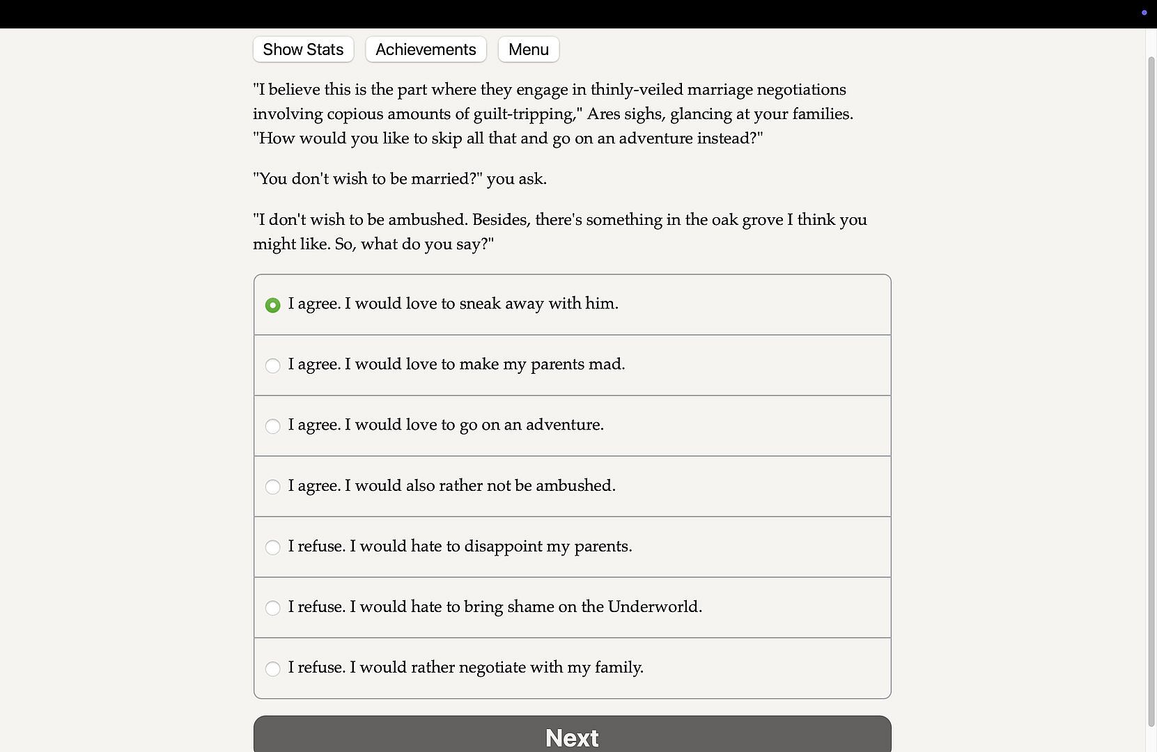 Hearts in Hades: Divine Passion is an interactive fantasy romance novel by Lidia Molina Whyte. It's entirely text-based, without graphics or sound effects, and fueled by the vast, unstoppable power of your imagination.