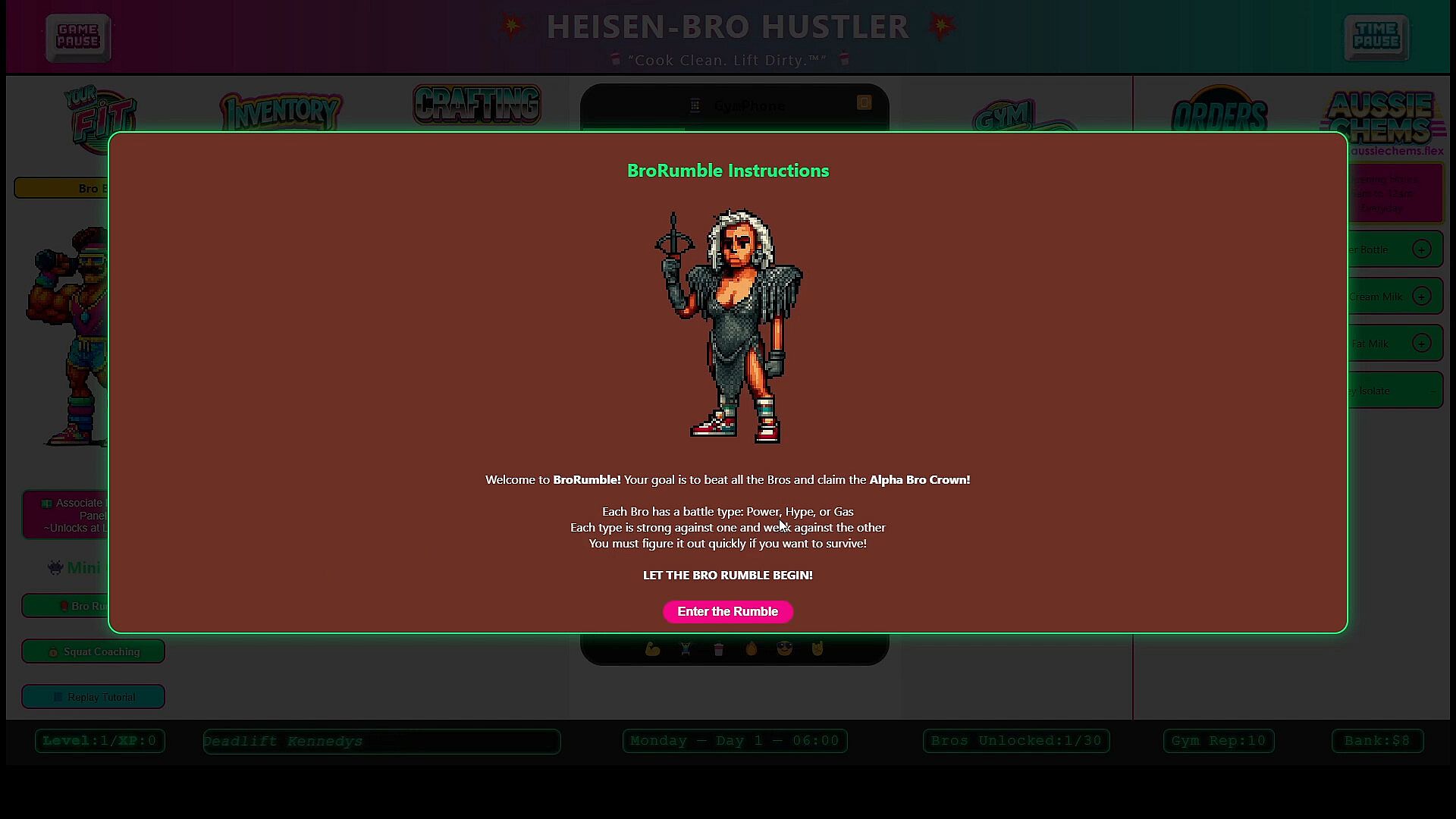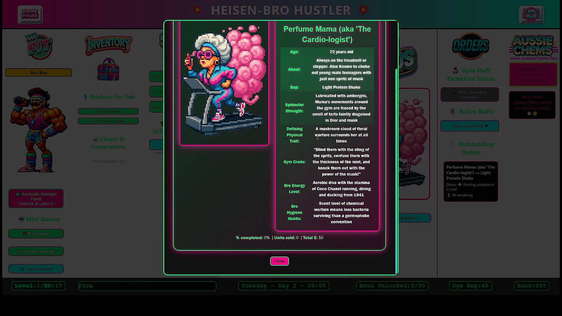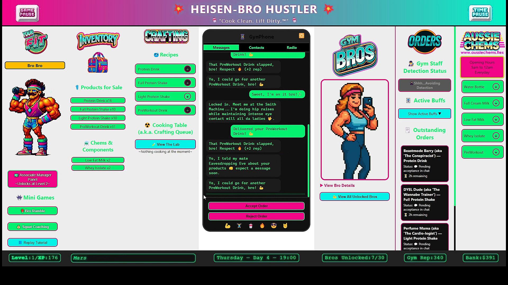 Buy chems from your supplier to craft supplements ordered by gym bros to make money, raise your rep and gain XP.