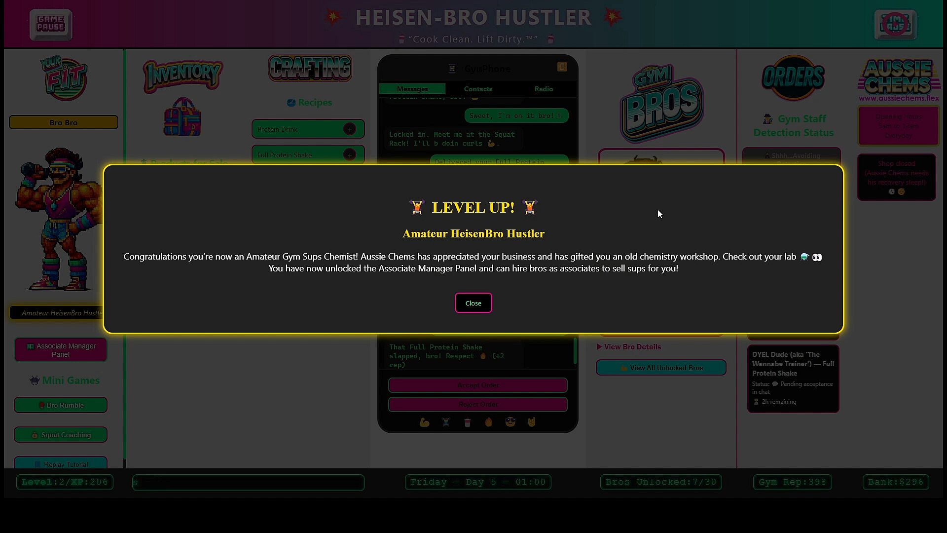 Raise XP to level up to unlock new features such as hiring associate bros who can sell supplements on your behalf.