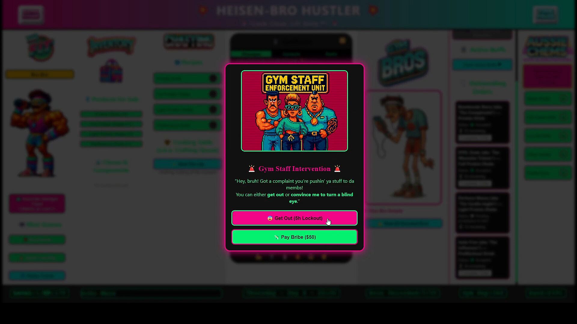 You wake up in a gym bathroom stall with no memory. You have nothing but what you're wearing, a gym bag, $20, a protein drink, a mobile phone, and a flyer for a chems dealer. Suddenly you start receiving orders from gym bros for gym supplements. It's time to start the hustle.