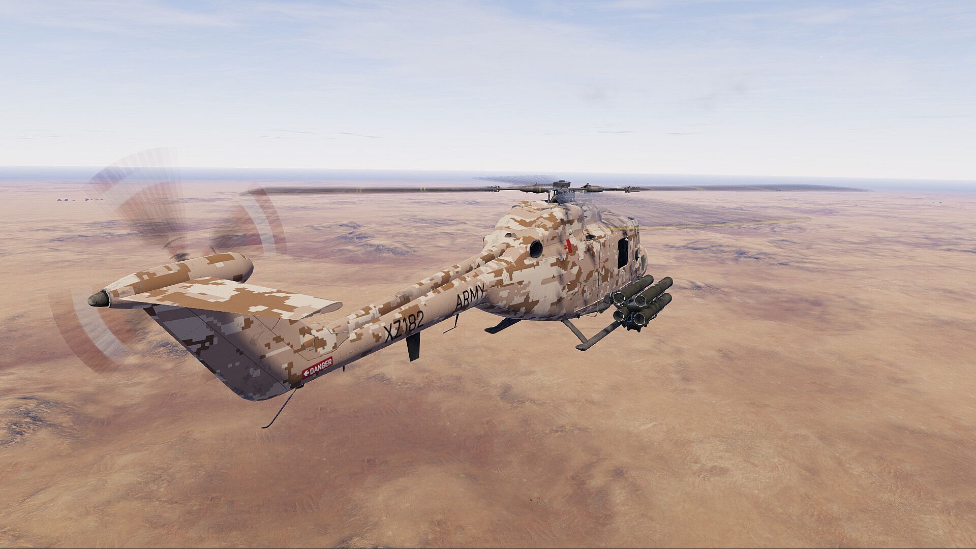 You won't find any magically respawning missiles here! Instead you will find realistic weapon load-outs, a simulation level physics driven helicopter flight model and the usual targeting pods and RADAR systems you would expect in this type of game. However, these systems have been simplified to give the overall "feeling" of being in control of a helicopter gunship without the need to memorise hundreds of keys.