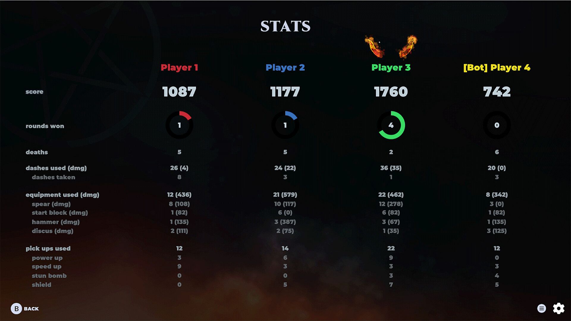 Fallen Olympians, former tricksters, and doping offenders are now battling it out in the deepest pits of hell. Here, 1-4 players engage in an infernal player vs player competition. Grab weapons and upgrades to take down your opponents - and always watch out for the lava. May the most ruthless prevail!