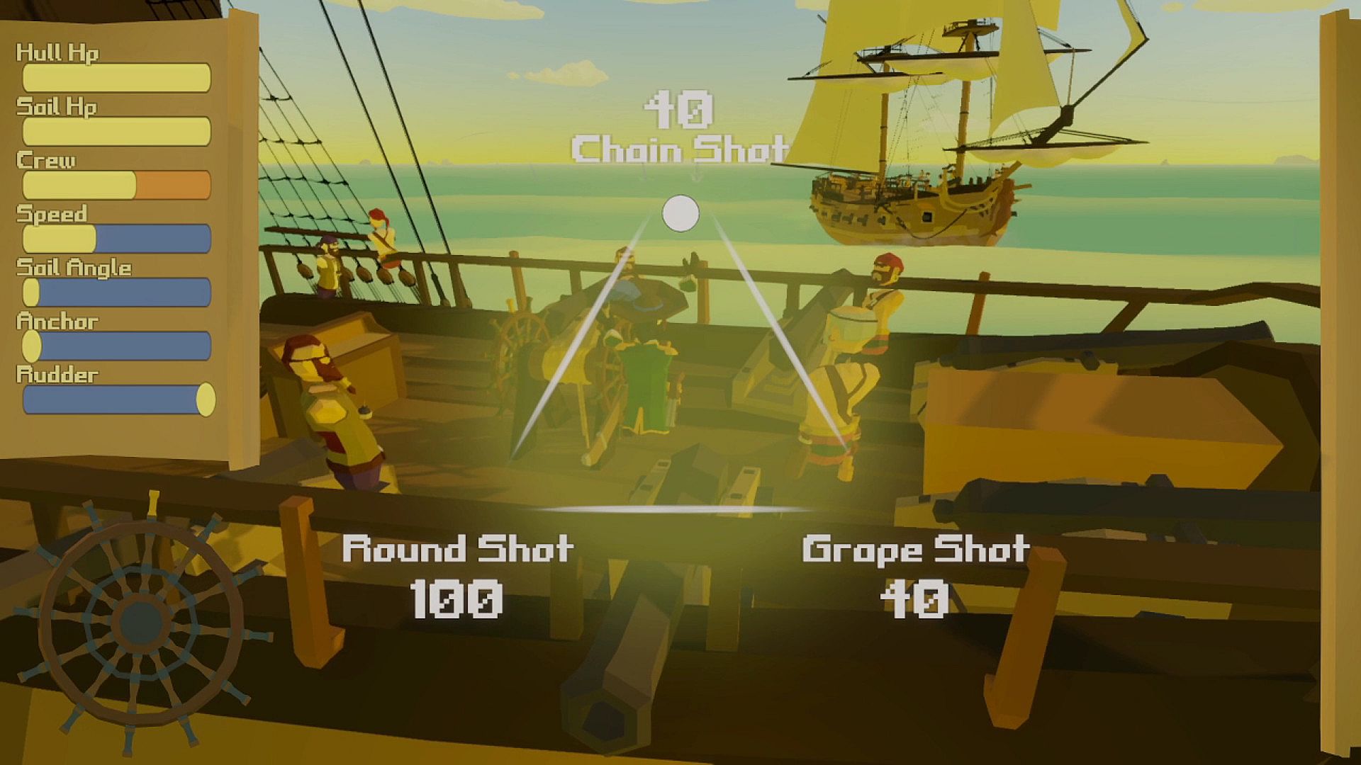 Choose your Ammo: Switch to Grape Shot for a better chance at hitting enemy crew, load the Chain Shot to do extra damage to the sails, or stick with Round Shot to damage the hull.