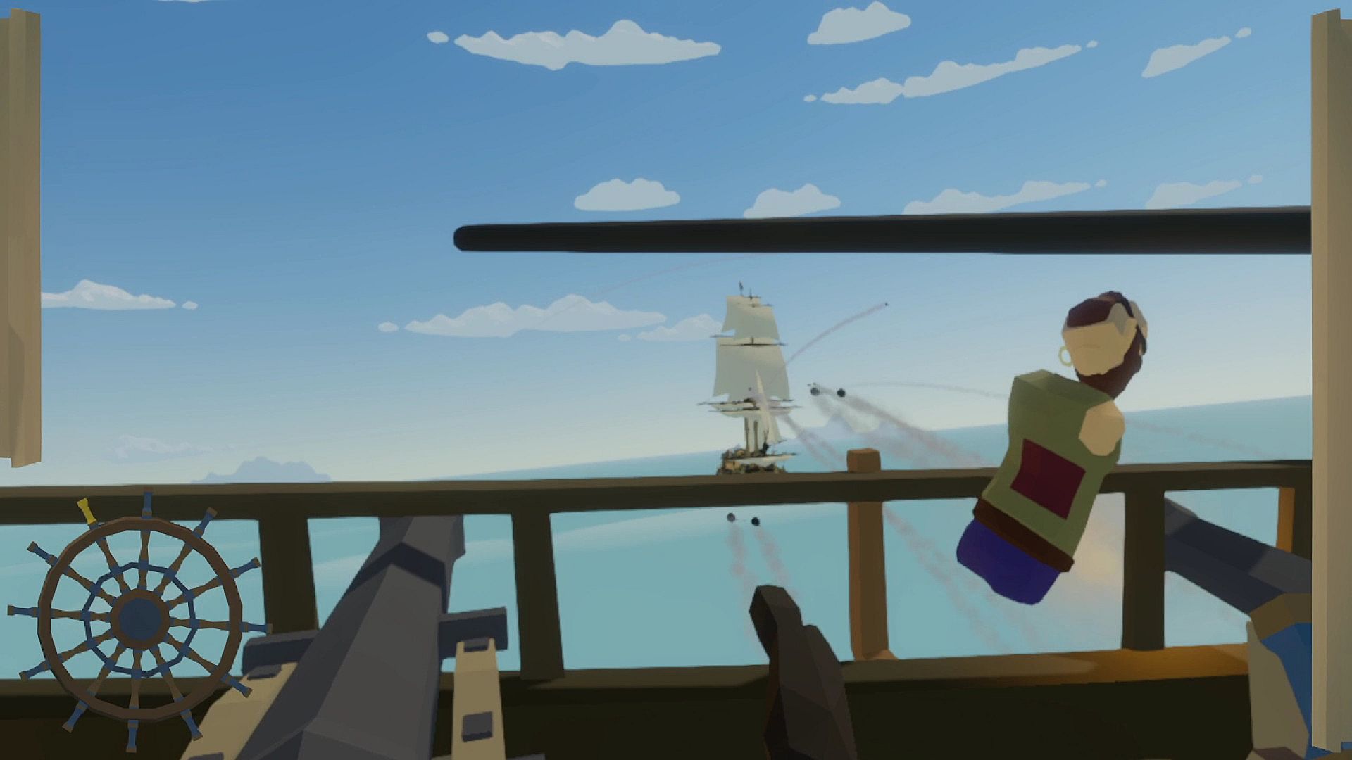 As the Captain (VR), steer the ship clear of danger, give the order to fire the cannons, use your flintlock pistols to thin out the enemy crew from afar, and your sword to defend yourself from boarders.