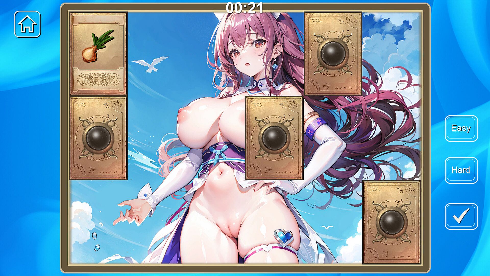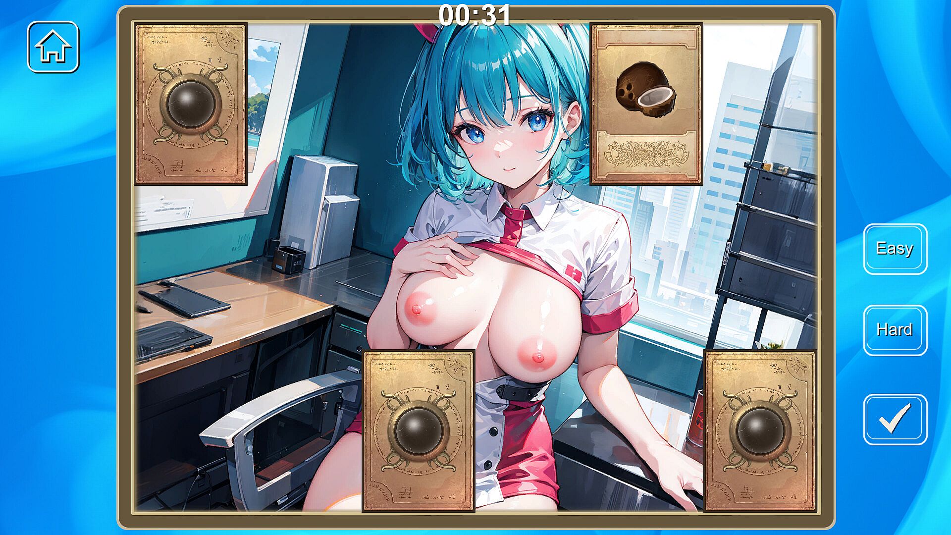 Hentai Girls Nurse is a reaction game , the cards are arranged in a grid on the screen. Initially, the cards will automatically flip over for a brief moment to reveal the images behind them, and then they will close again. The player's task is to click on each card to make them disappear and uncover the images underneath. The goal is to clear all the cards from the screen. Once all the cards have been revealed and removed, the player will advance to the next level. The game requires demands quick reflexes and intense concentration. The difficulty increases with each level, challenging the player more and more as they progress.
