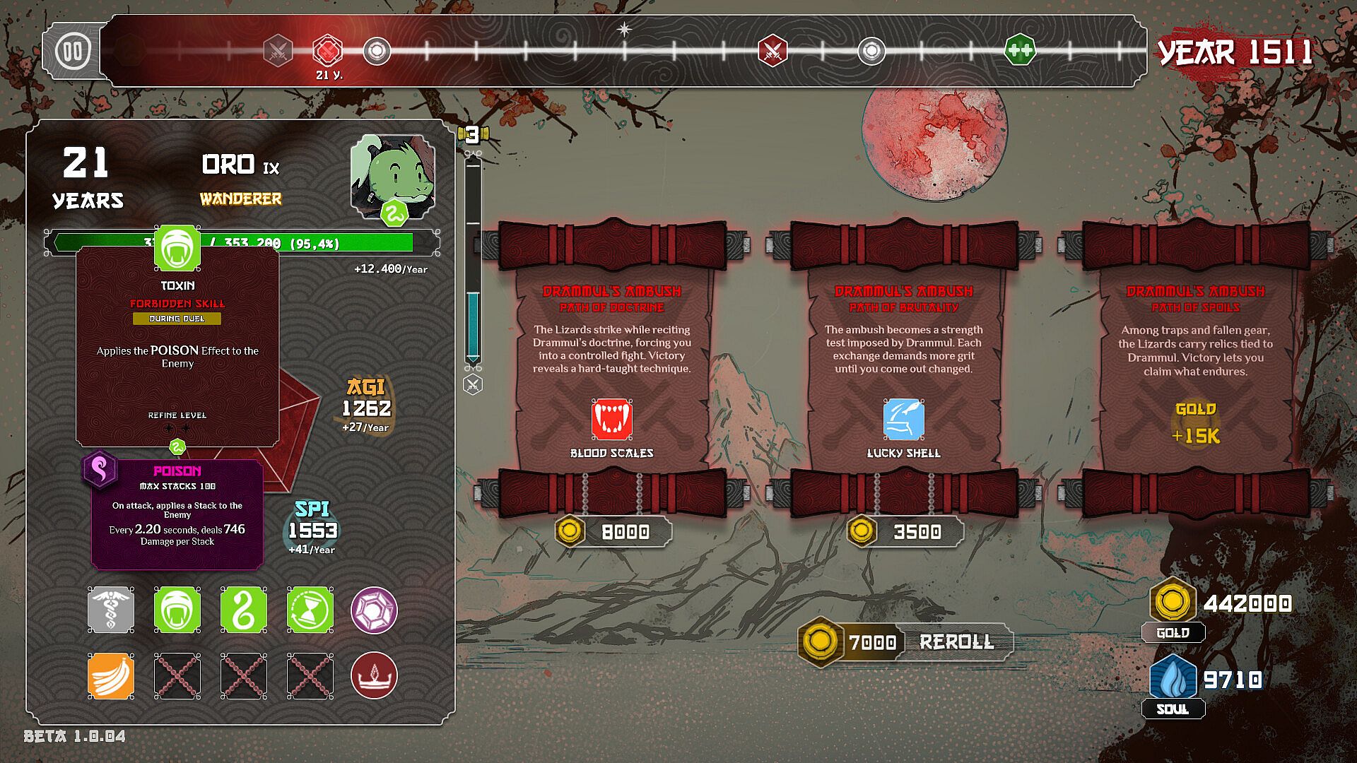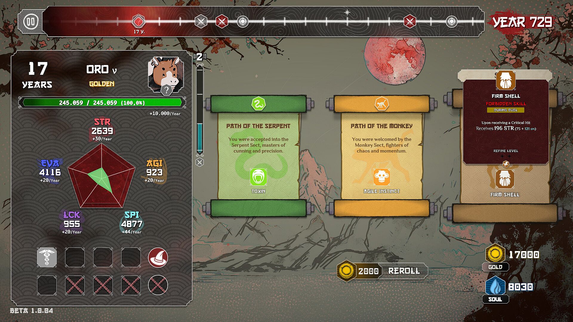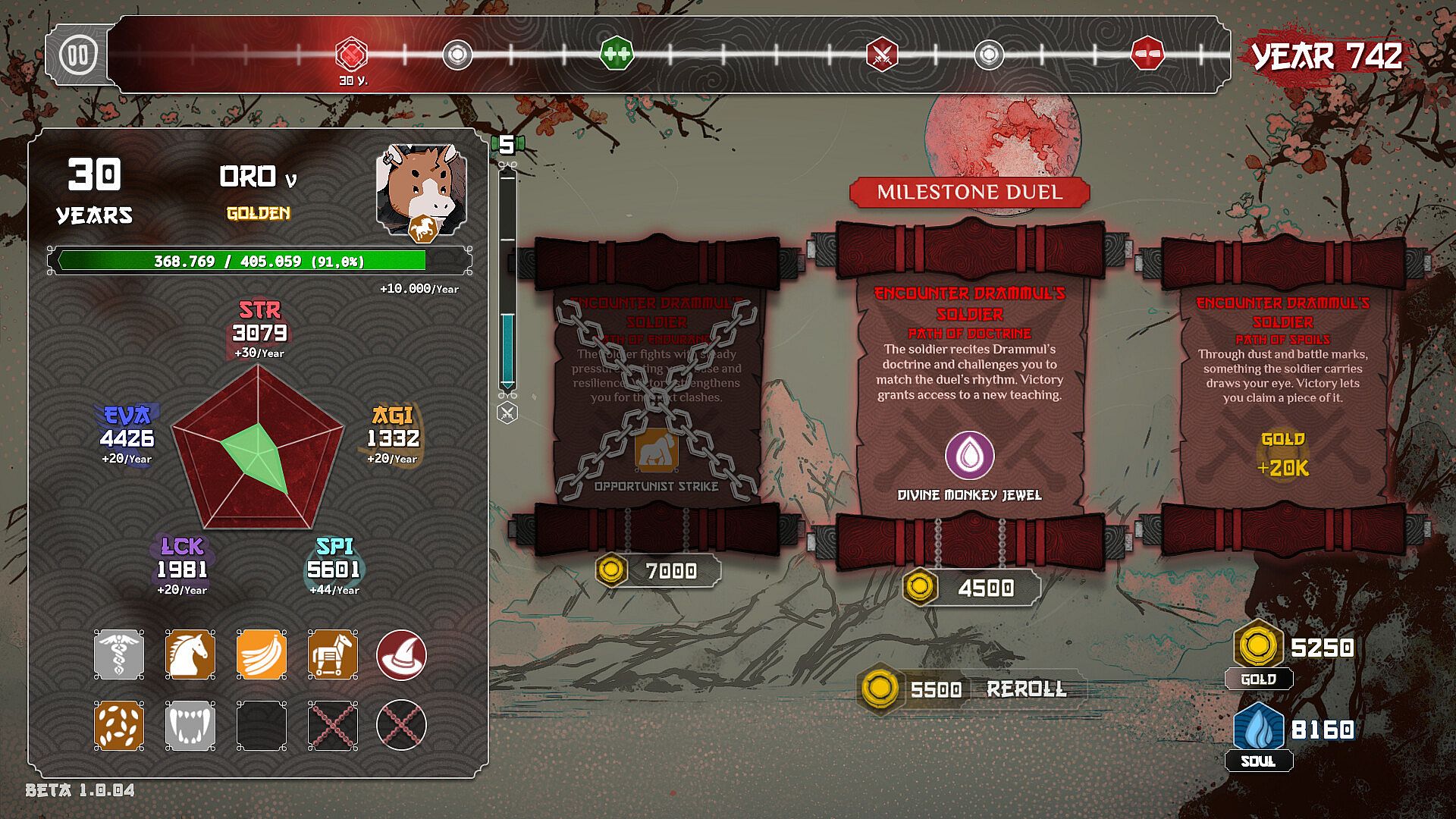 From there, your life progresses year by year, always faced with three Scrolls. Each choice can grant attributes, percentage bonuses, gold, healing, equipment, unlocks or even battles that completely change the direction of the run. Growing steadily over decades or chasing immediate power can be the difference between staying alive or falling far too soon.