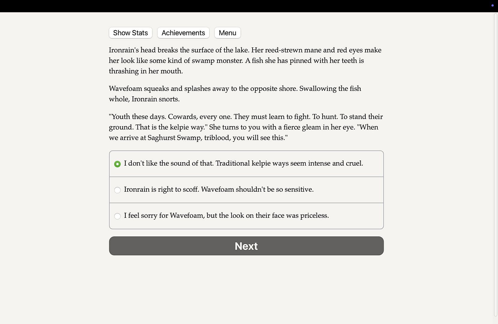 • Surrender your sanity to kelpie bloodlust or convert the kelpies to vegetarianism.