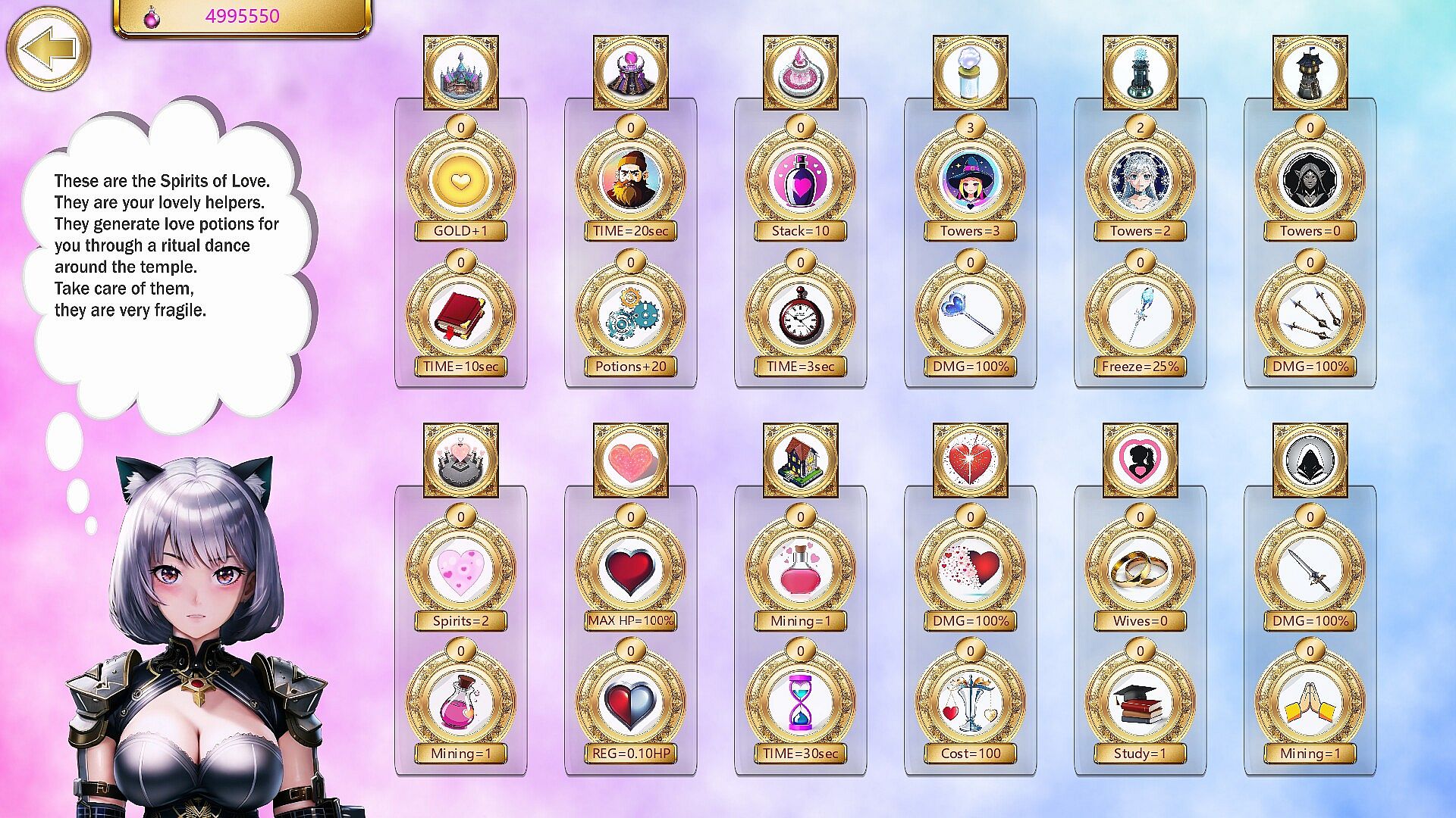 Protect 4 temples of the Goddess Luxuria located in different parts of the world in order to accumulate enough Love Potions. This is a very important resource because only with the help of Love Potions can the seal of the magical prison be broken, in which all the Priestesses of Love and the Goddess Luxuria herself are imprisoned.