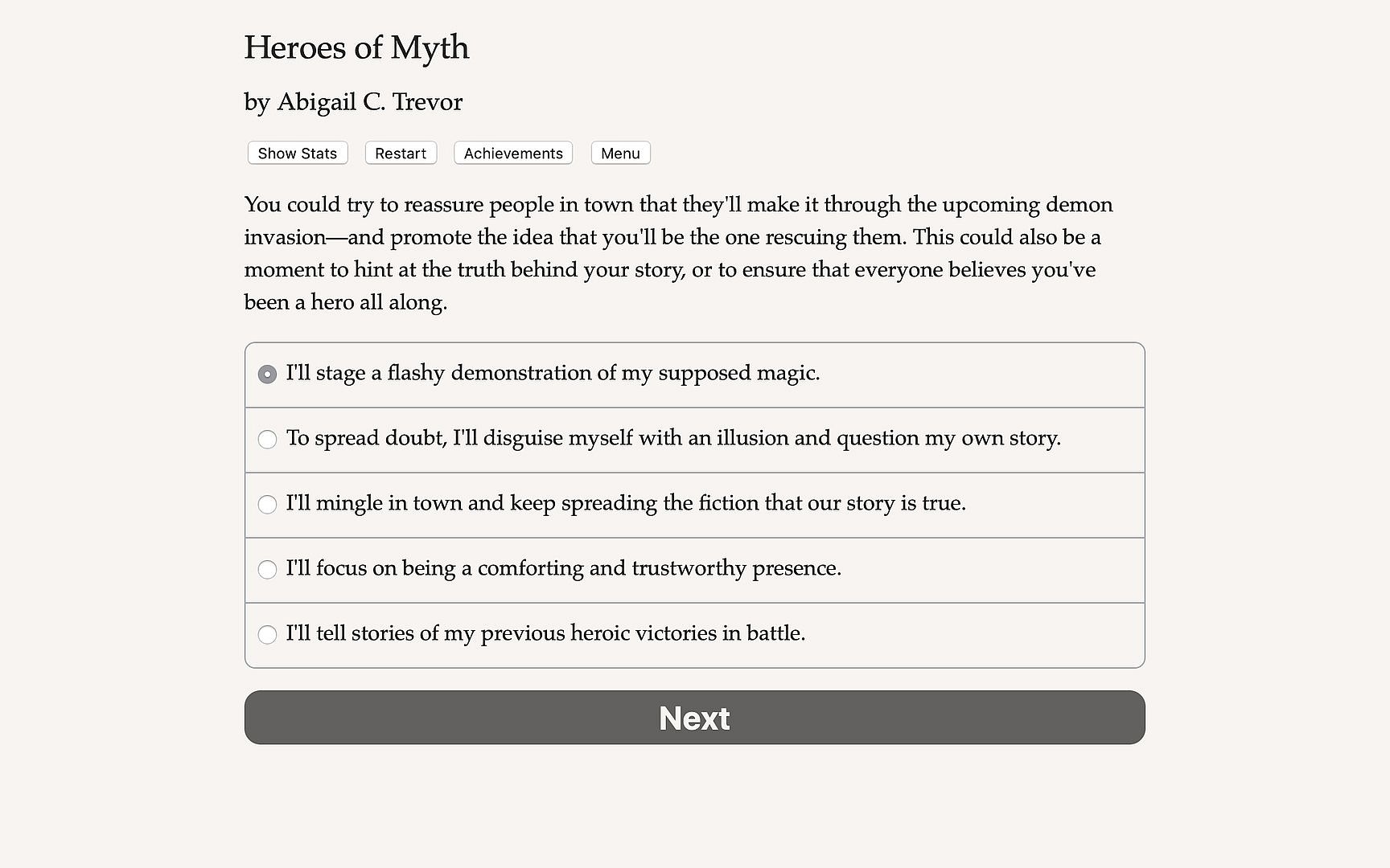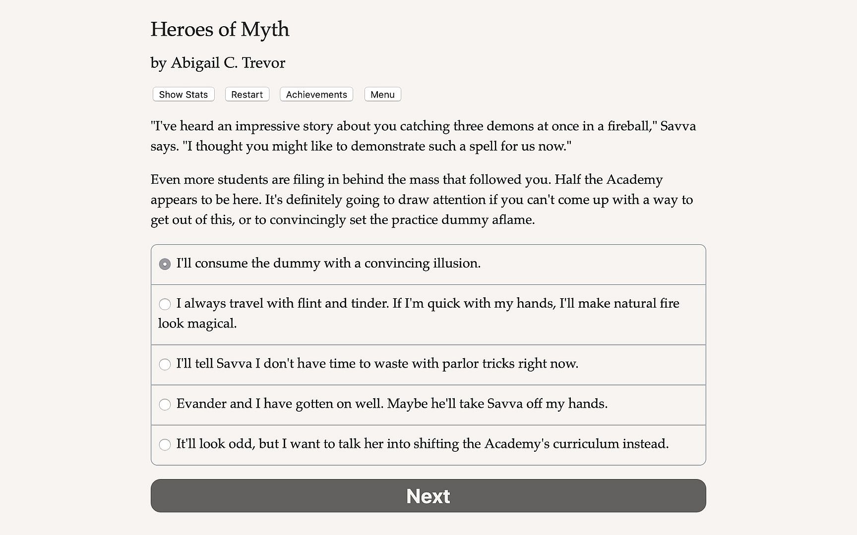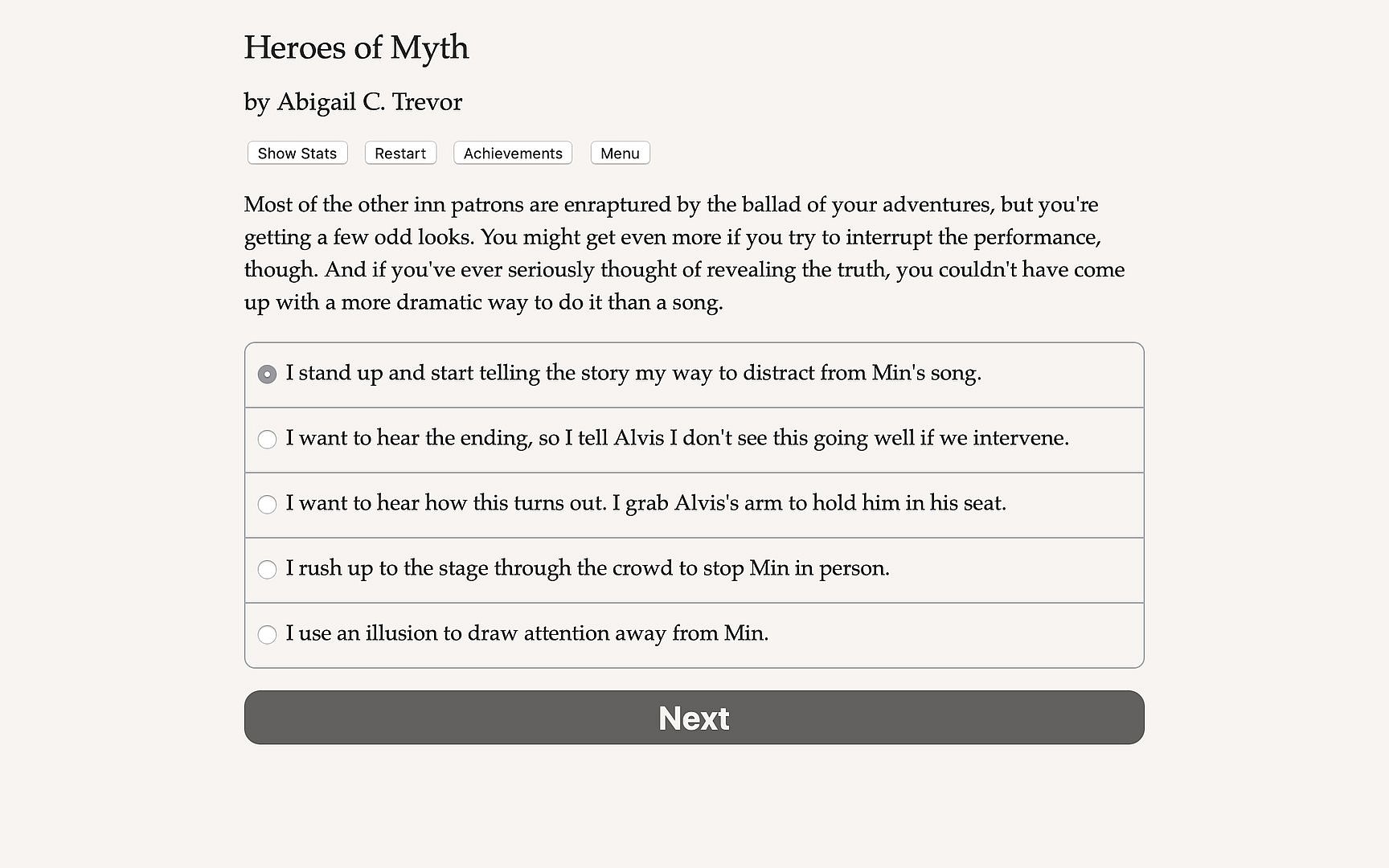 Heroes of Myth is a 560,000-word interactive novel by Abigail C. Trevor, where your choices control the story. It's entirely text-based, without graphics or sound effects, and fueled by the vast, unstoppable power of your imagination.