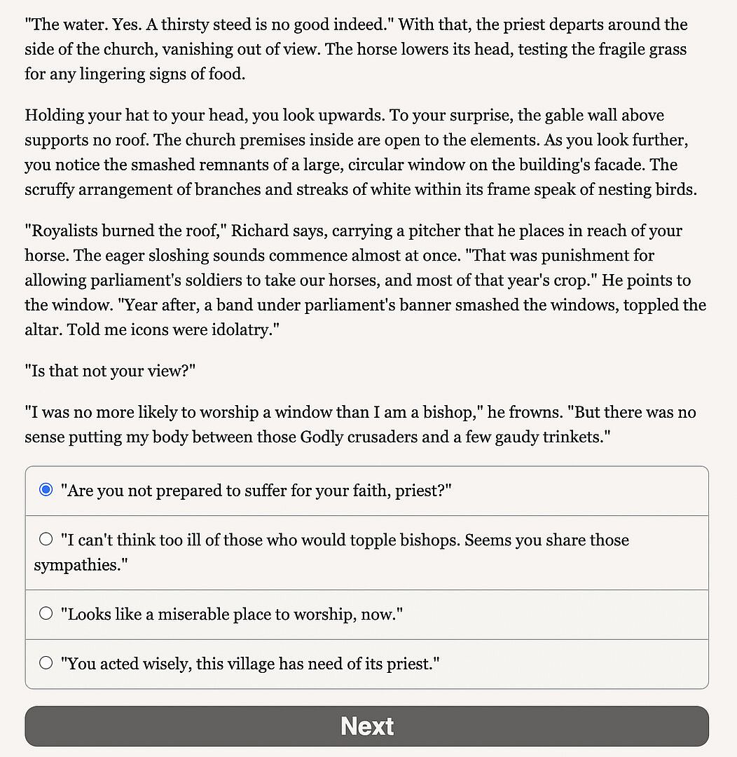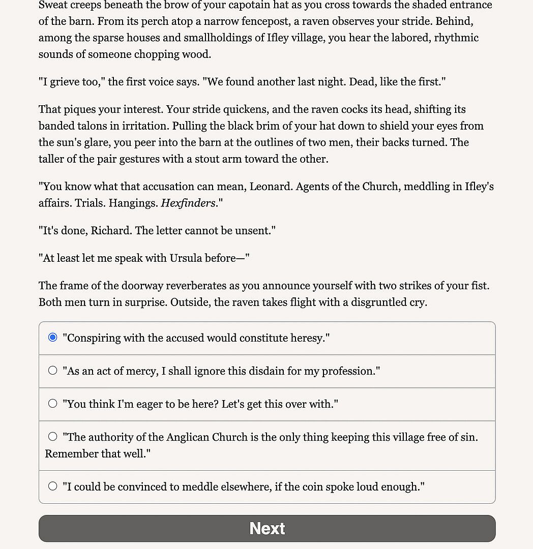 You will play a hexfinder in the employ of Queen Charlotte’s Anglican Church, tasked with seeking out the witches and warlocks (colloquially known as hexcrafters) who threaten her fair nation. It is June, and the summer solstice approaches. Charlotte announces her intention to return to Oxford, her seat of power during the most turbulent years of the civil war. Assigned to investigate the Oxfordshire villages along the queen’s route of travel, you will begin to uncover signs of heretical treachery at the heart of your sovereign’s court.