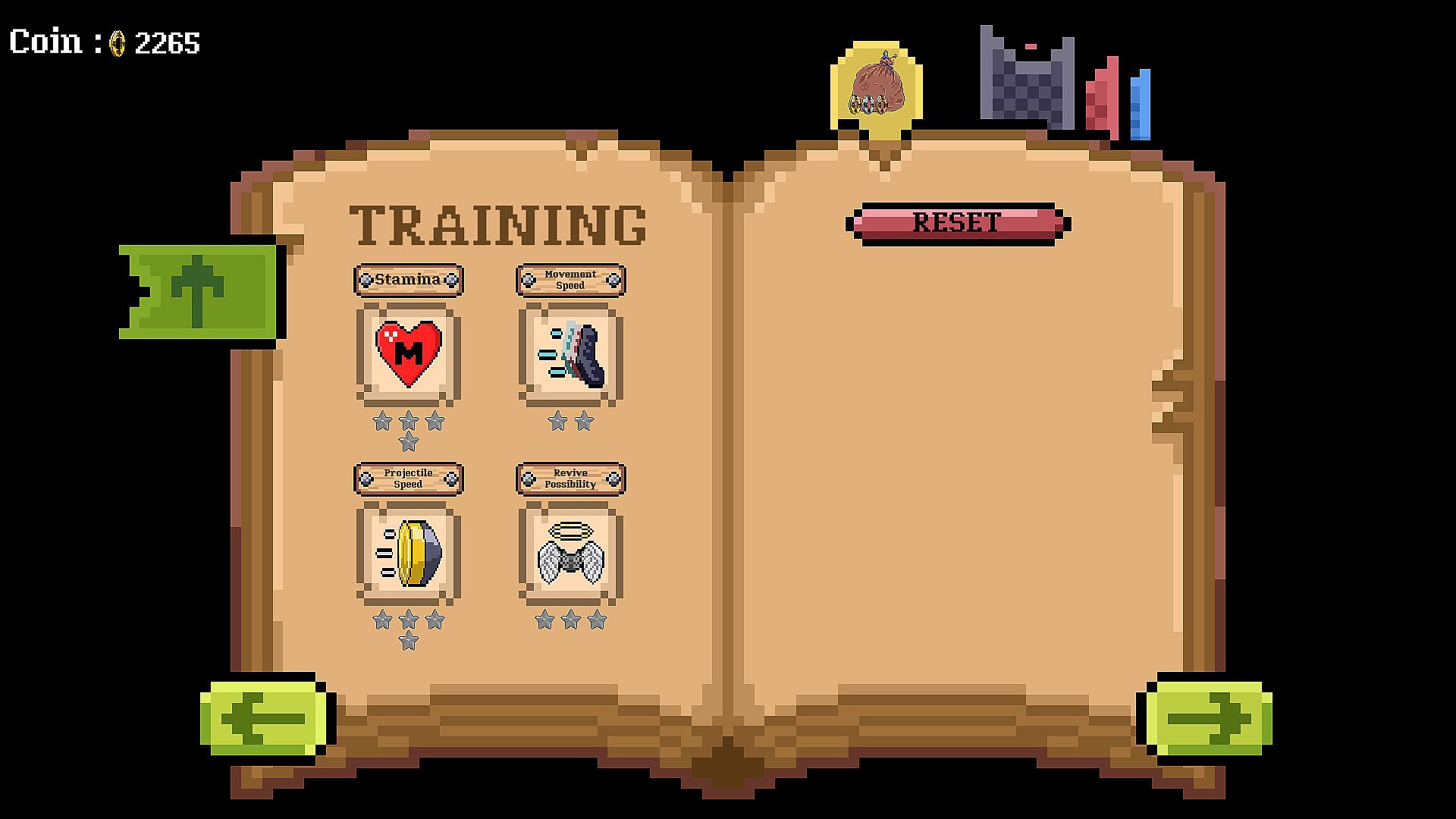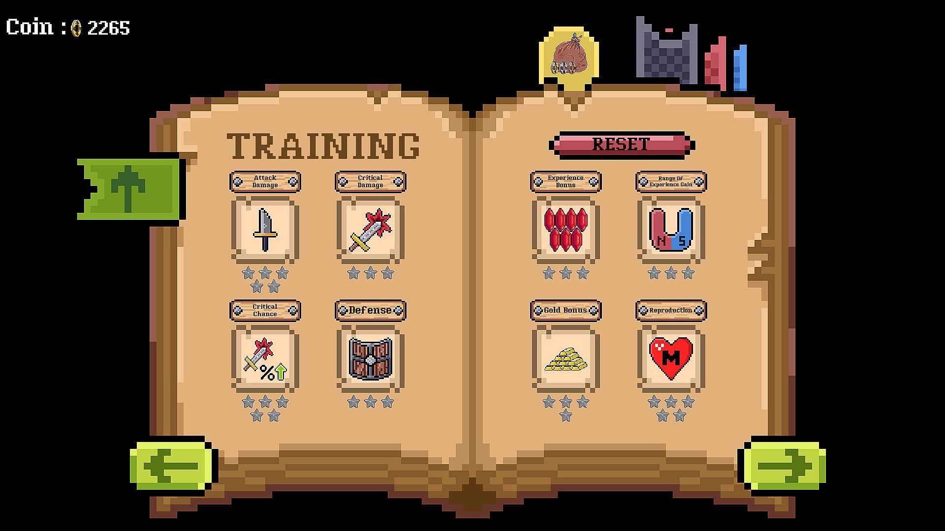 Gather gold to permanently upgrade various effects on the training page and reset for free.