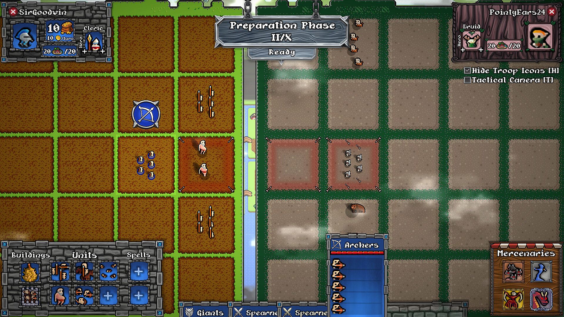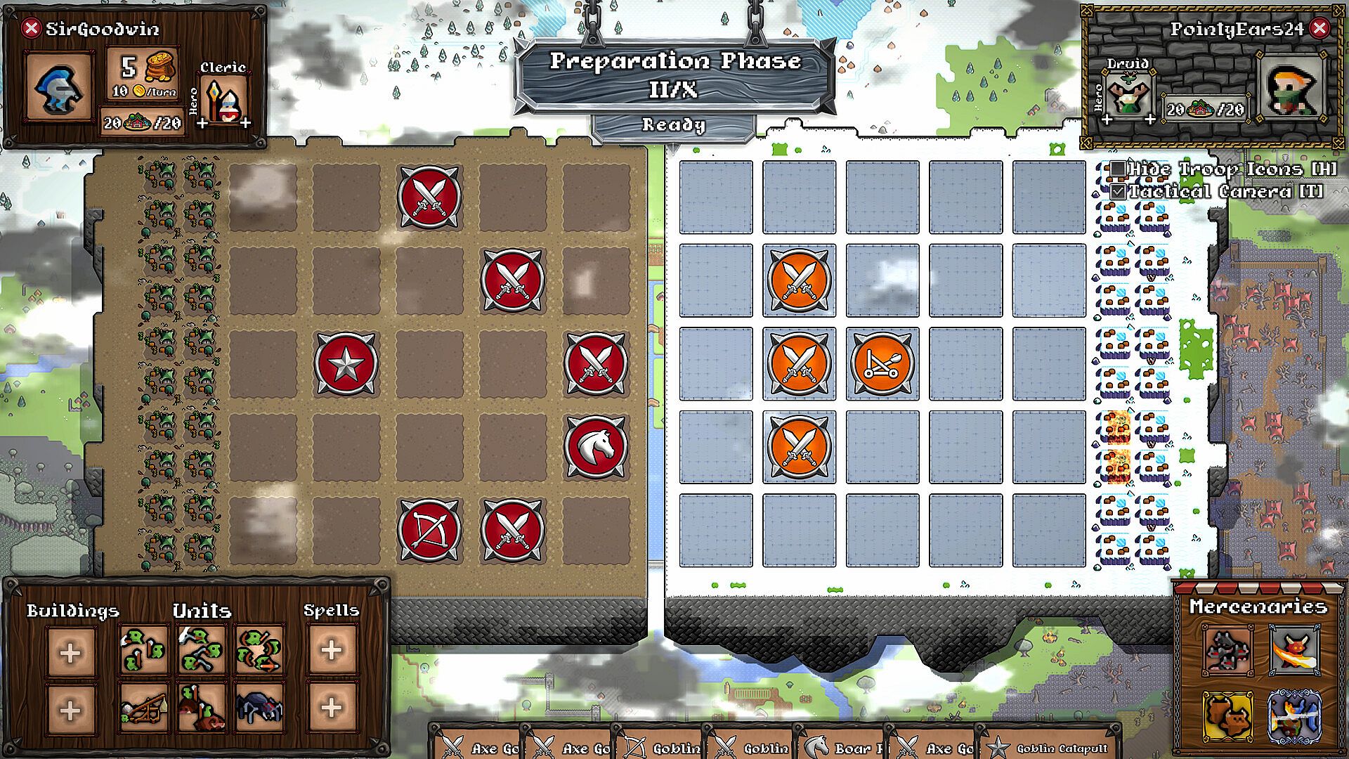 Place units and buildings on your side of the battlefield during the Preparation phase. You win a game of Hidden Tactics by destroying the opponent's villages, located at the end of each lane. Carefully manage your gold income and anticipate your enemy's next move by strategically placing your troops or using game-changing spells.