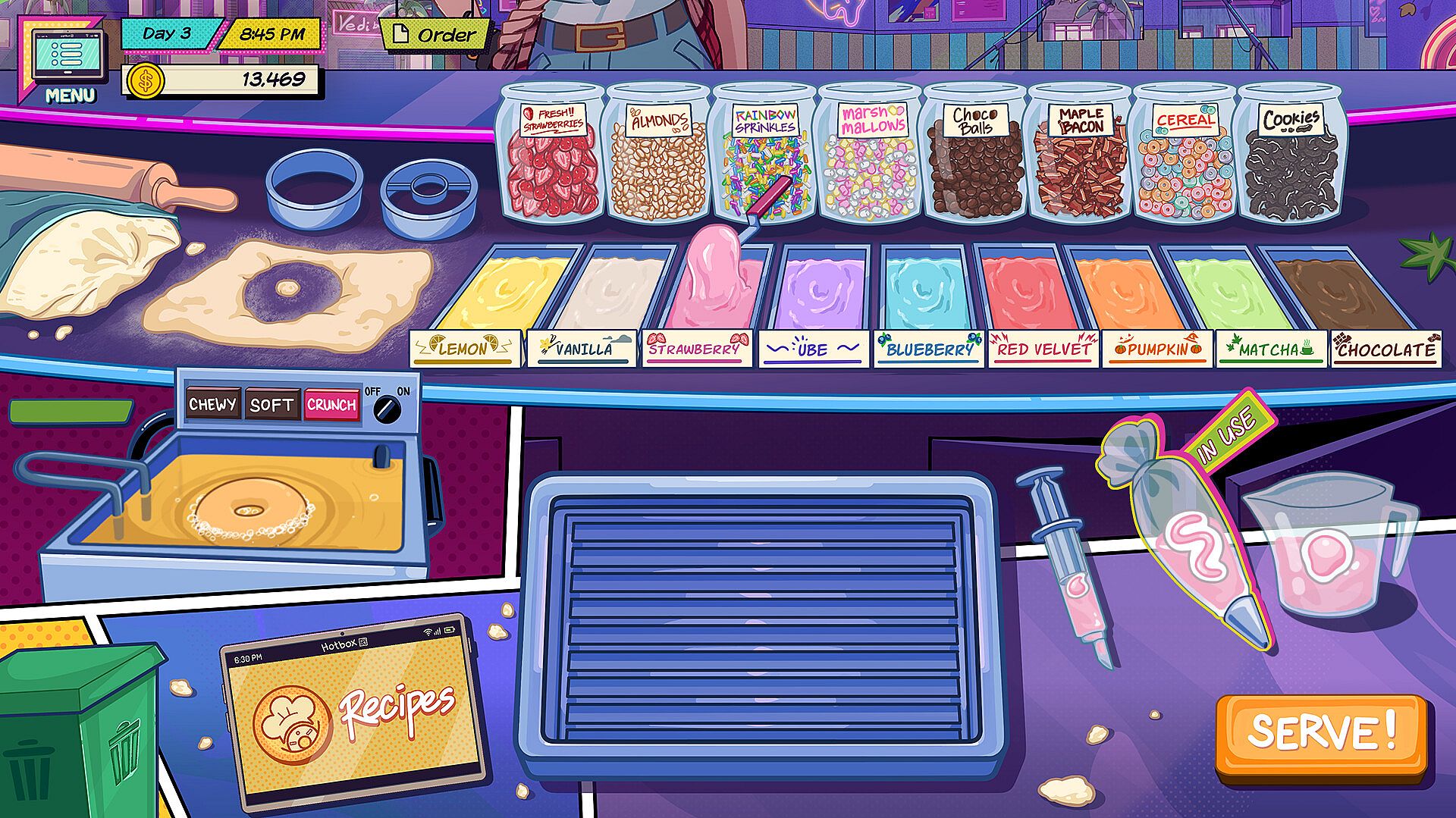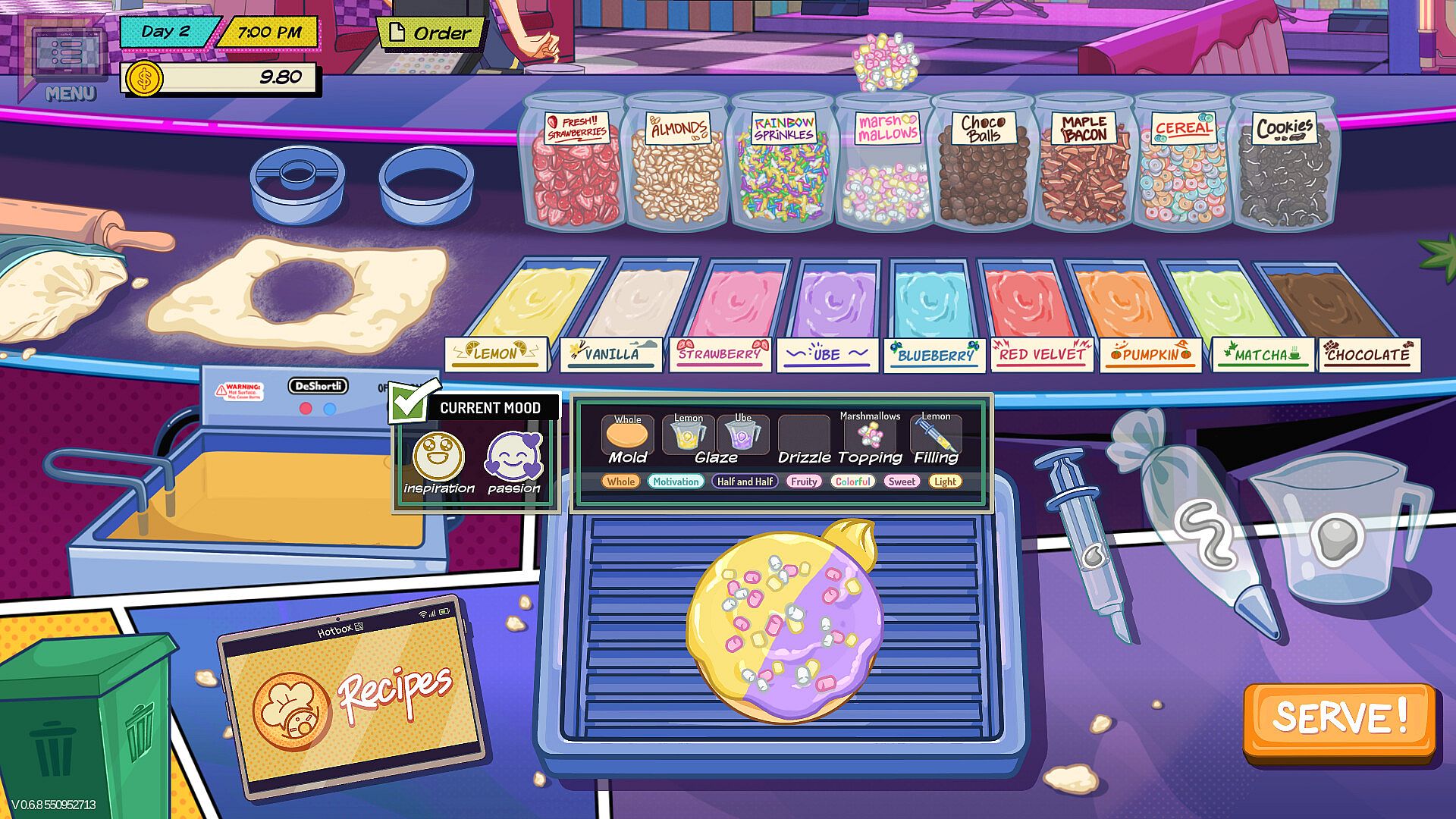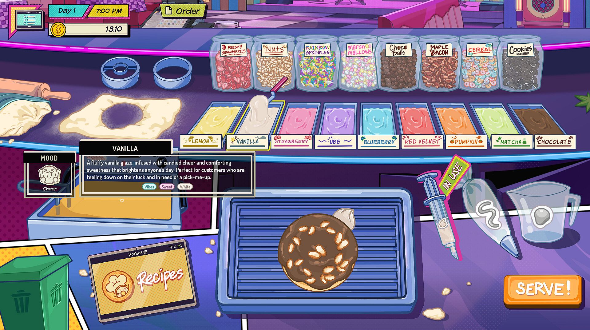 In a world where one can literally eat their feelings, you work at The Hotbox, a special donut shop where the donuts you make are infused with mood enhancers — a substance that changes the emotions of your customers. From flavors that'll give them more courage, to ones that cheer them up, it's up to you to figure out which mood is best suited to help your troubled customers.