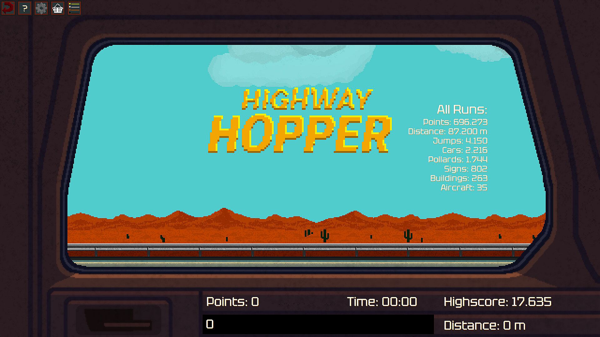 Highway Hopper is a fast-paced 2D pixel art platformer where you jump over guardrails along an endless highway. Dodge cars, signs, airplanes, and buildings, collect points, and beat your high score! With simple controls, stylish retro design, and an engaging flow, every jump is a little thrill.