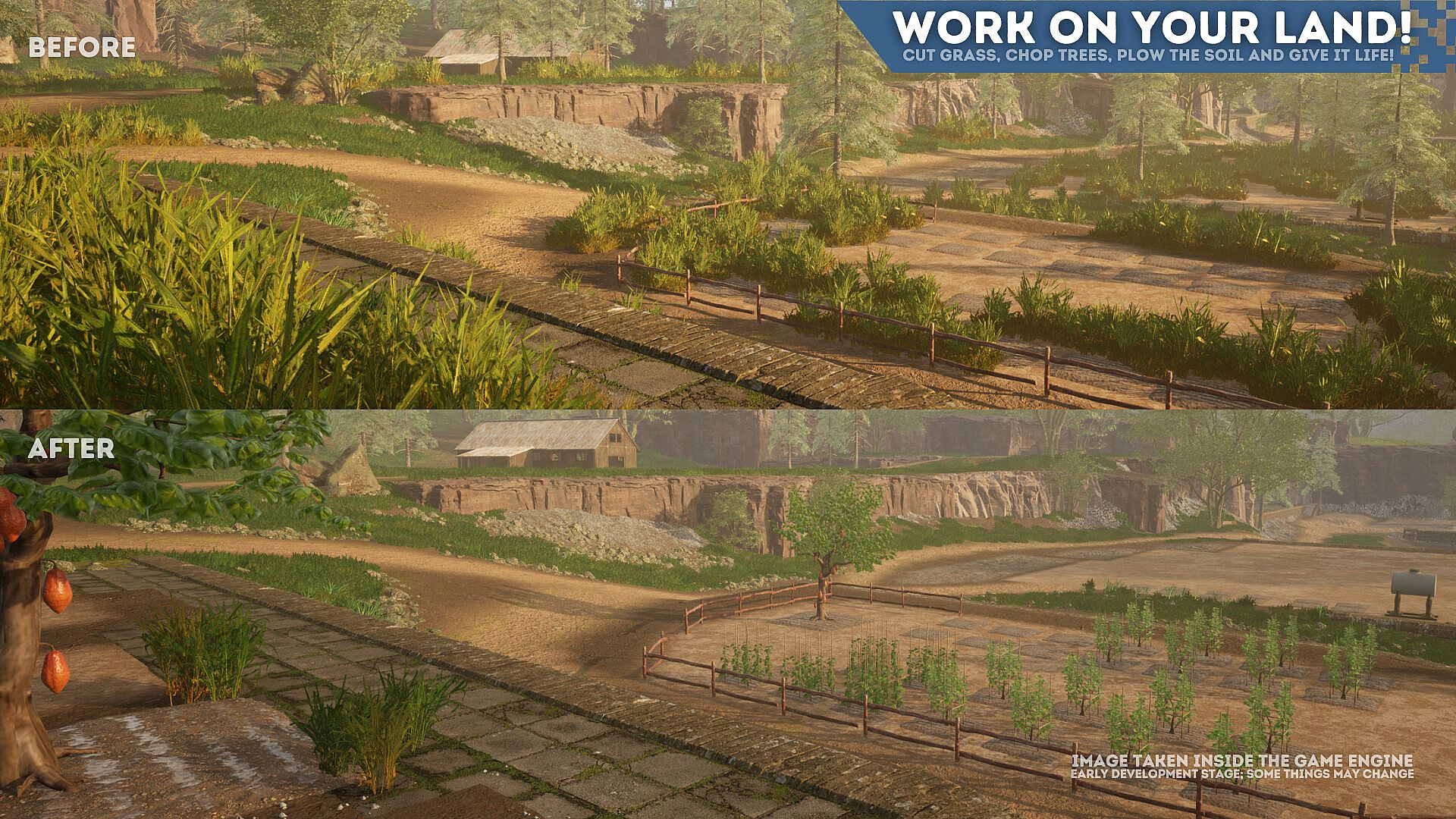 Clear the land, gather raw materials, and start building your farm from the ground up. Trim overgrowth, chop down trees, and turn logs into planks, stakes, and other essentials.