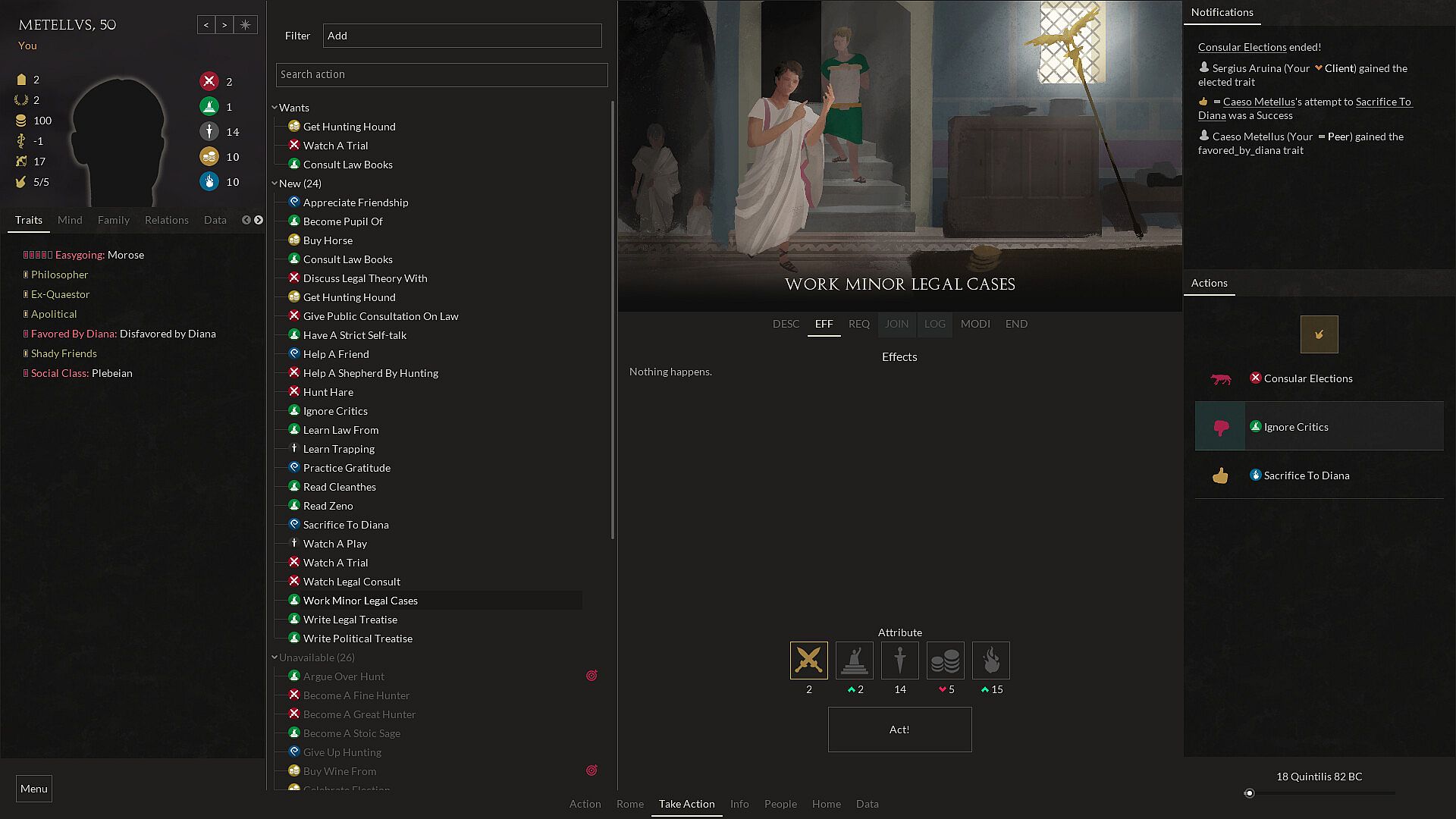 Characters have deep inner worlds: hundreds of traits with multiple levels each, including personality traits such as Wise, Indulgent, Unethical, Trustworthy, Hotheaded and historical traits like Stoic, Epicurean, Poet, Playwright, Farmer, Winemaker and many more.