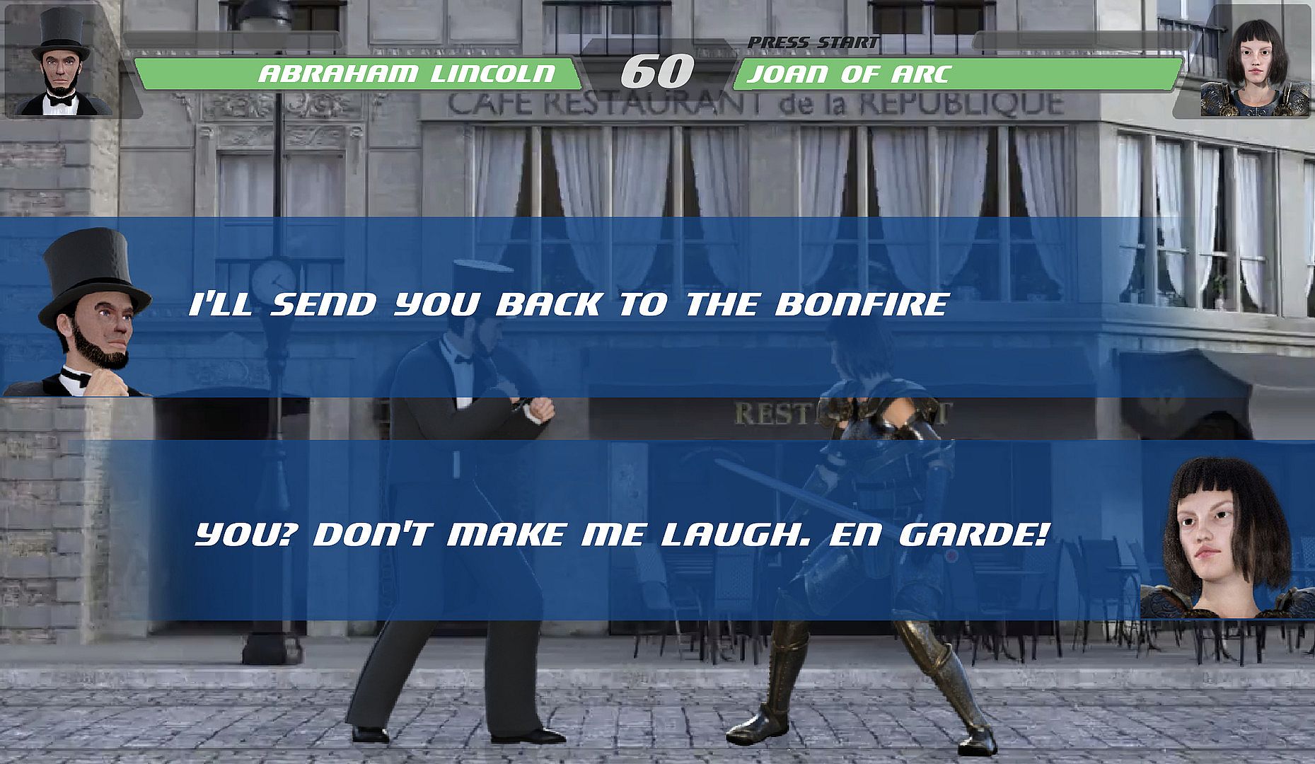 History Warriors brings to present time the following fighters: Abraham Lincoln, Joan of Arc, Cleopatra, Shaka Zulu, William Shakespeare, Ernesto "Che" Guevara, Napoleon and Mozart.
