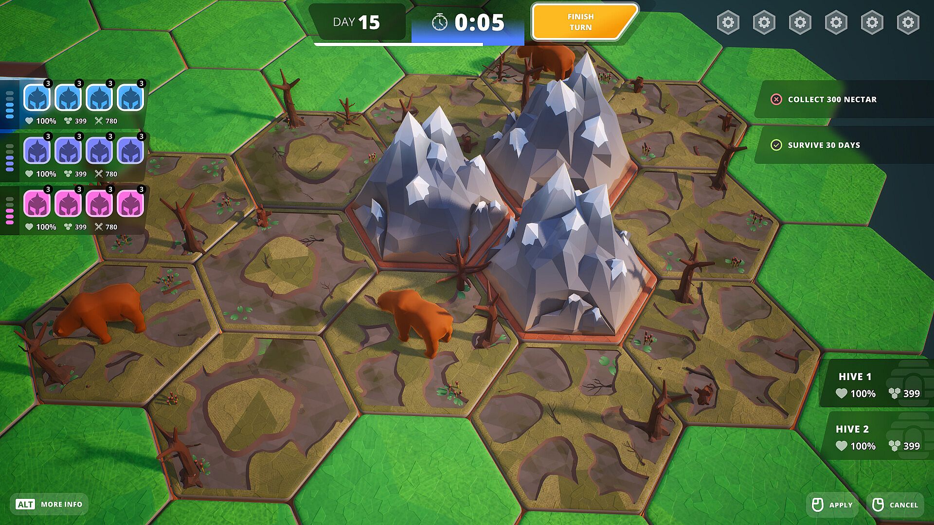 However, on the game map your bees will encounter natural enemies that will try to hinder your progress. For example, a bee-eating bird will hunt your bees, reducing their population, and a roaming bear may try to devour the whole hive!