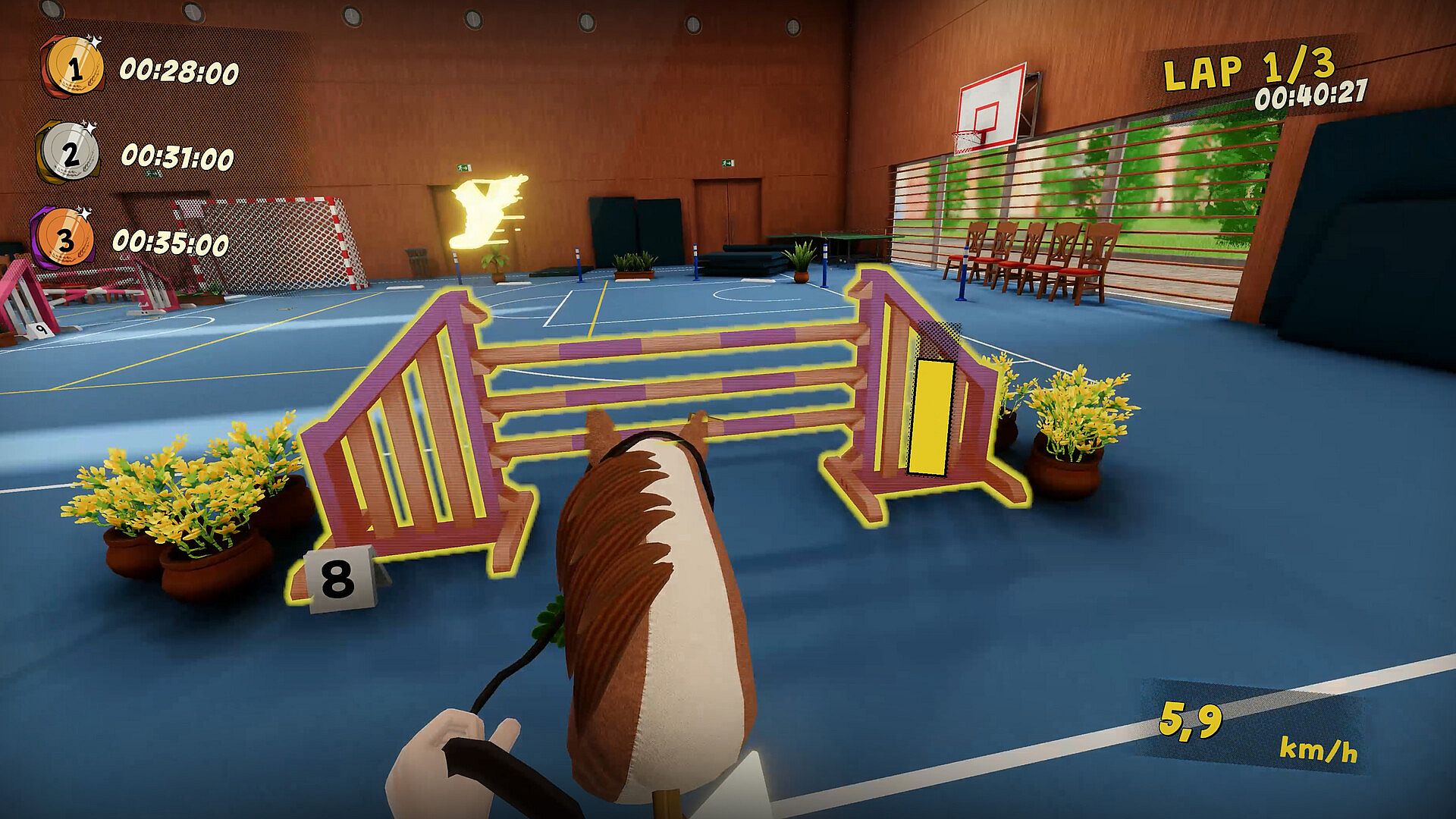 Each obstacle course is scattered with various boosters that can give you an edge while riding. Get yeeted up into the air to jump over an impossibly tall hurdle or get a speed boost to zoom through the course. Select your horse according to your needs - whether you want to focus on speed or jump height, you can pick a hobby horse to carry you to the podium!