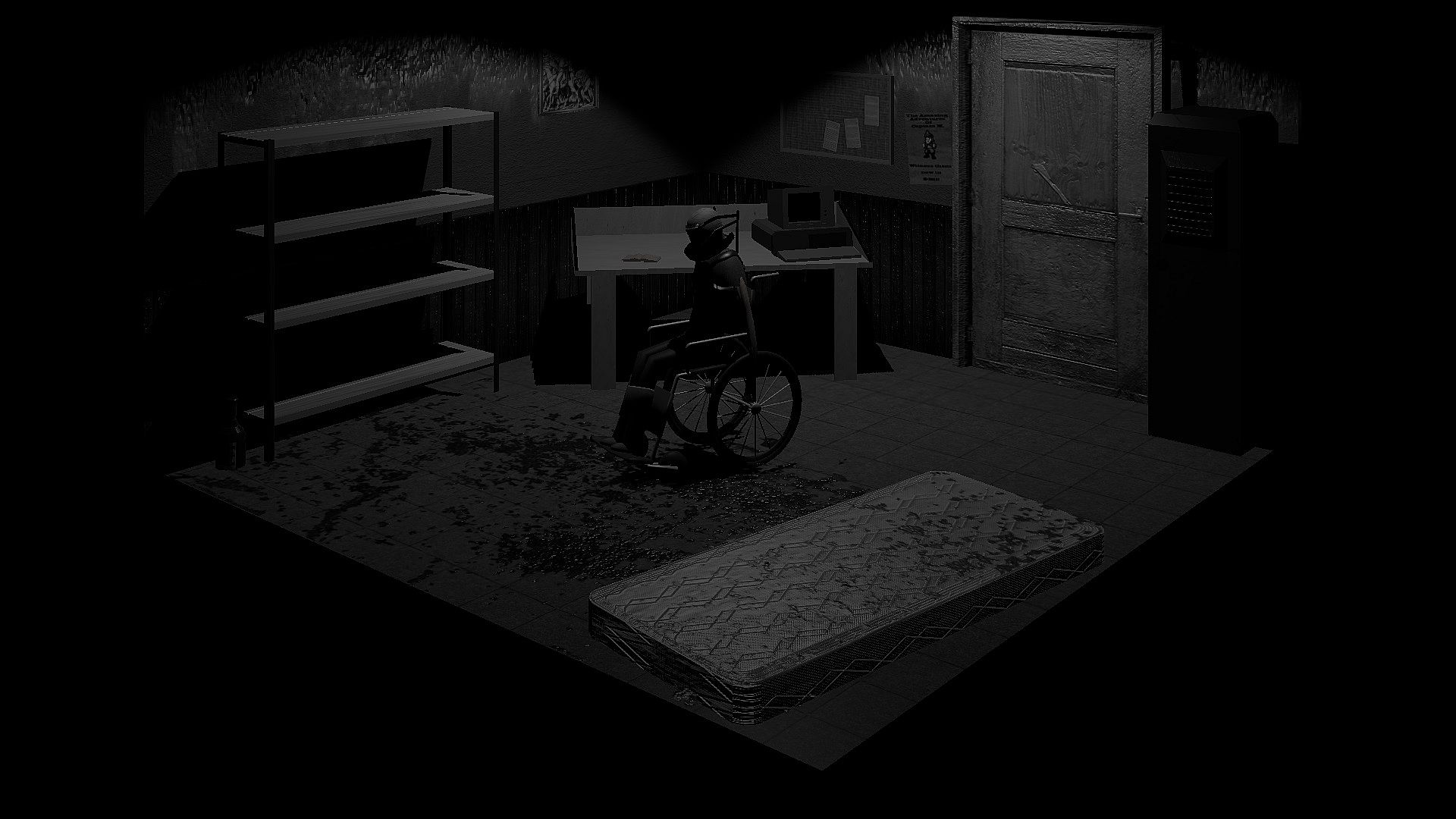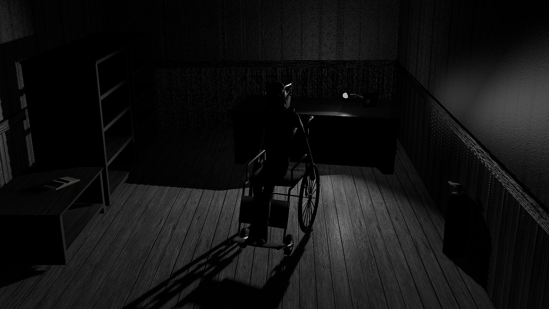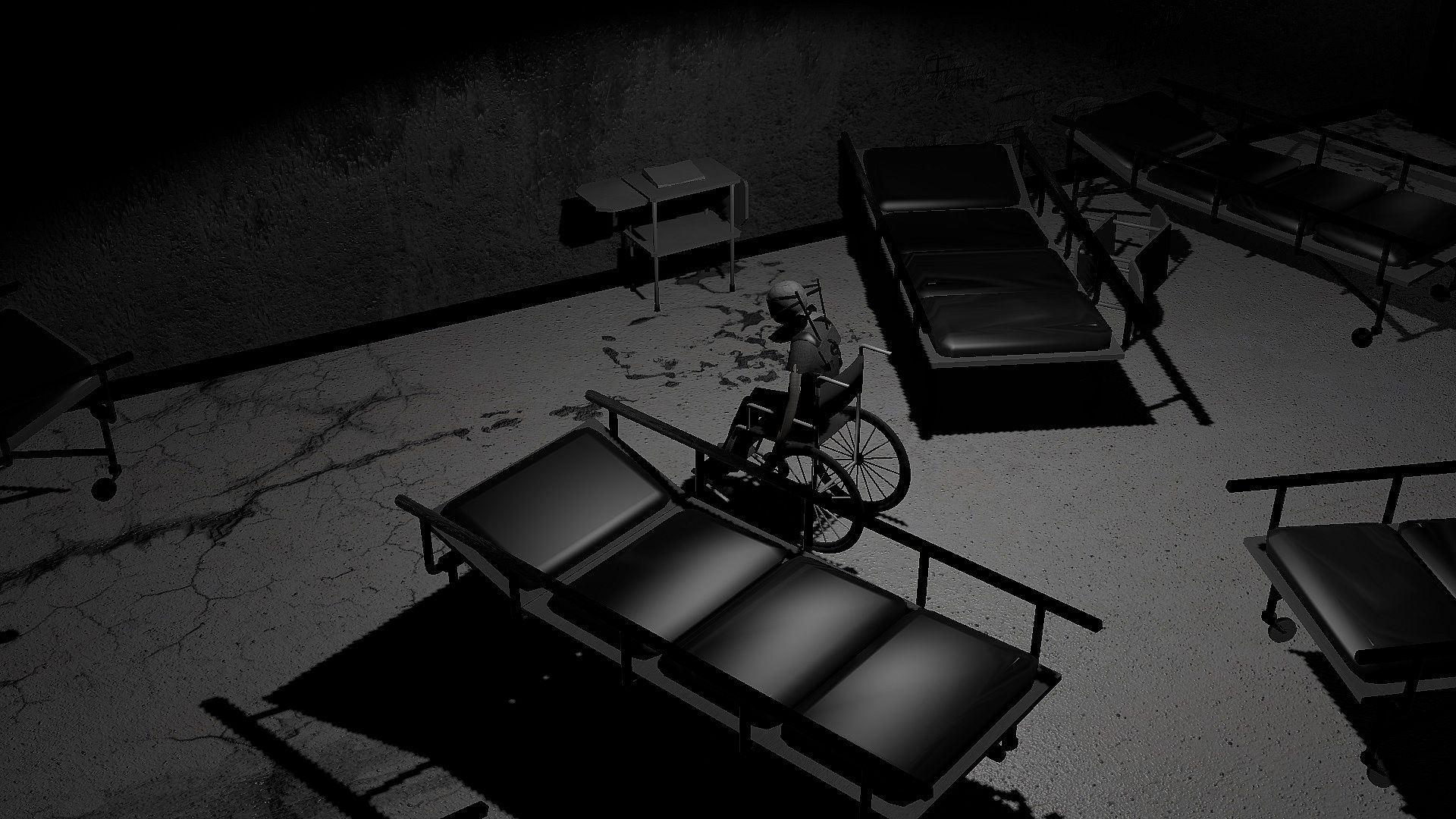 For a reason unknown, your legs have stopped working. Your arms barely have strength to move yourself forward in an old wheelchair. There is not a single living human in the dimly lit facility where you remain trapped. From these settings, you'll have to escape, to get out of this place. During that journey you may learn what happened to you, and what went on in here.