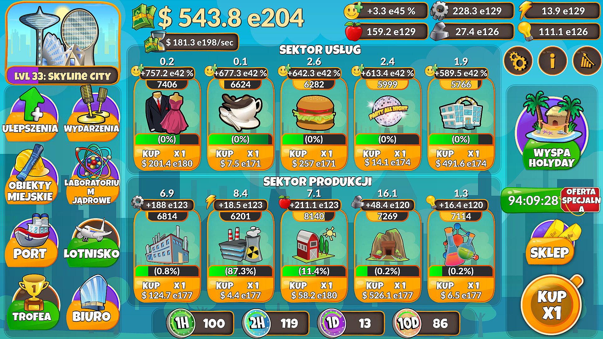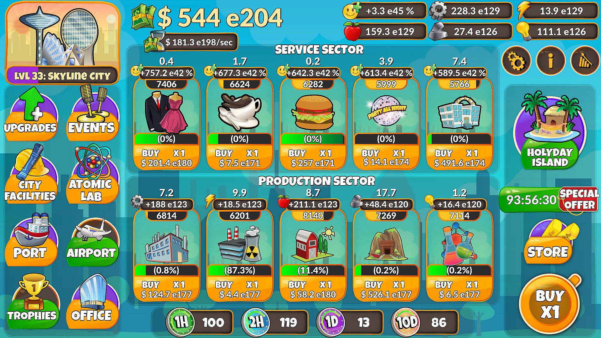 As an idle game, your city will level up and expand as the game plays in the background. Clicker game mechanics let you build and manage your businesses with a simple tap, so city expansion is a matter of time and management.