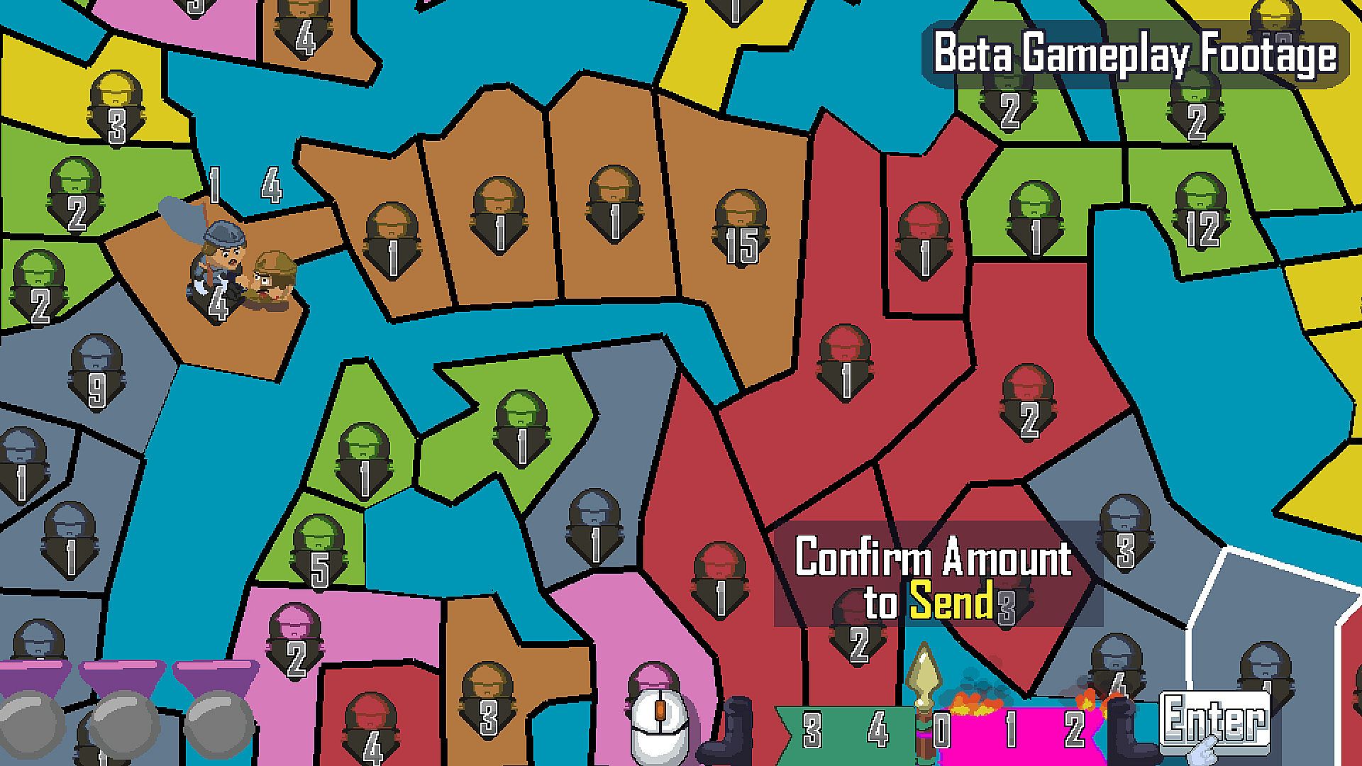 Home Before Winter is a turn-based, strategy game with a shoot'em up mini game. Feel the cold power of your Gatling gun rip through your enemy, mobilize your troops and send them to conquer adjacent territories, but be sure to save enough men for when the enemy sends out a counter-offensive. Complete objective cards to gain bonuses and help your men conquer the world!