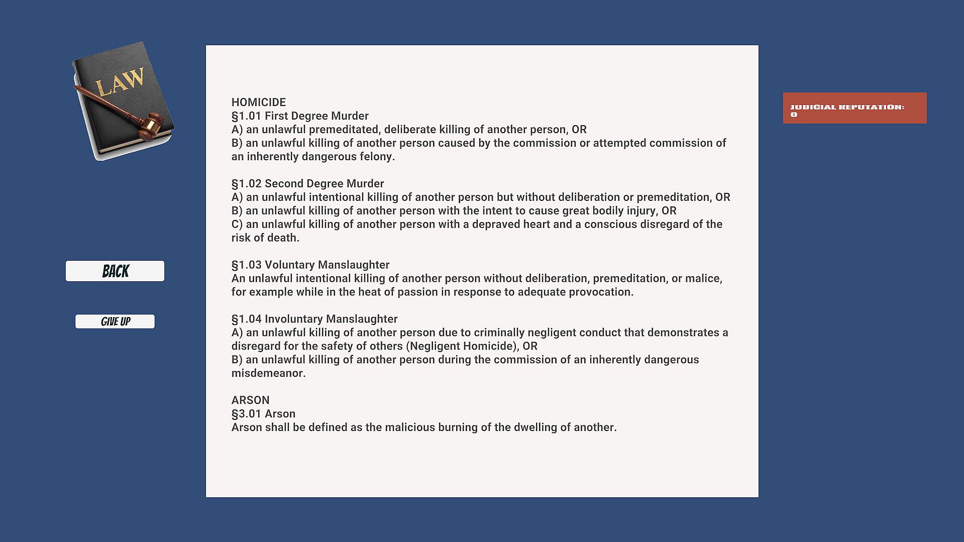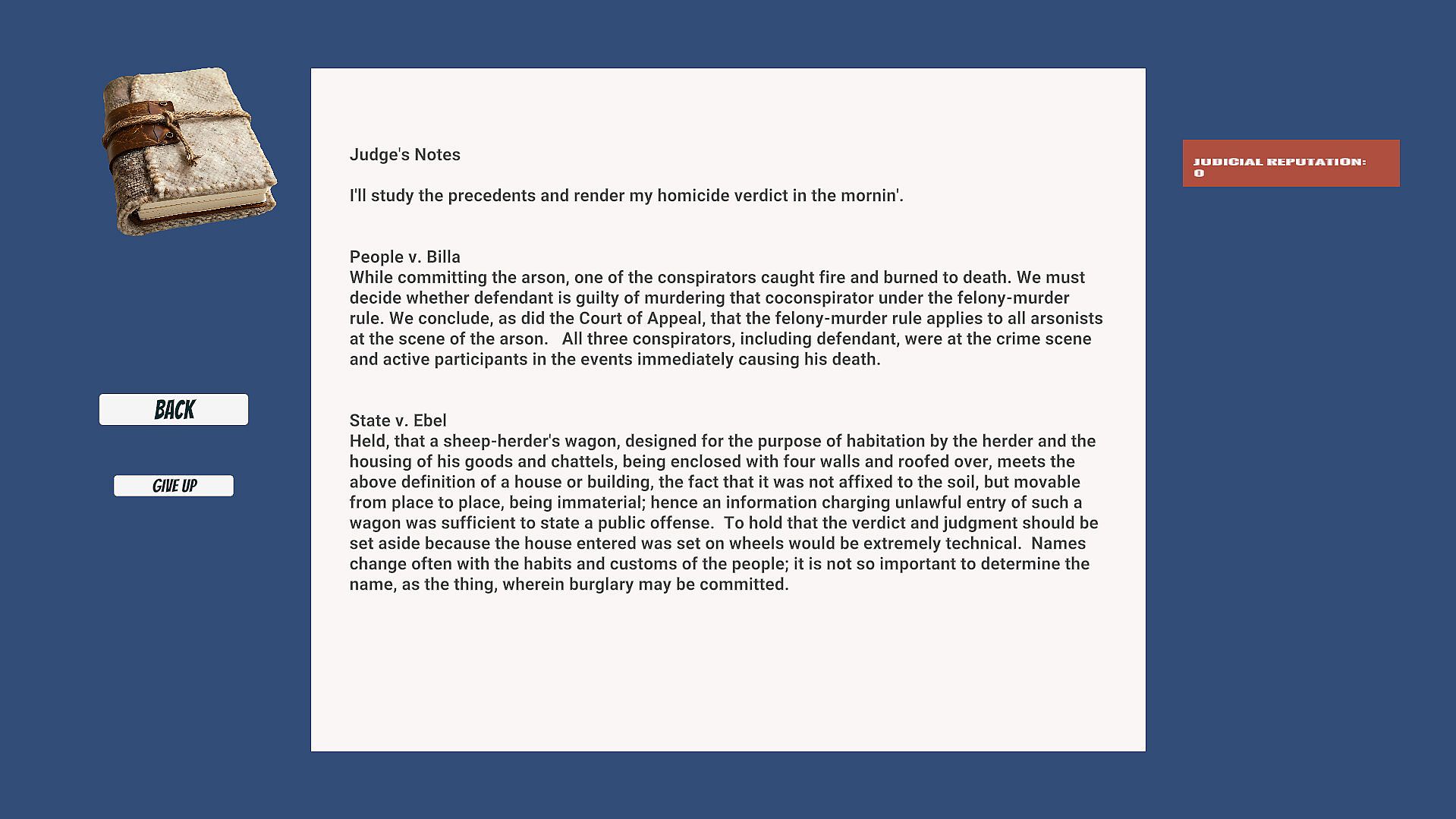 Practice Your Legal Writing: Law students, before entering your verdict, consider writing a short essay explaining your reasoning. This simulates a Criminal Law exam or bar exam question. Compare what you wrote to the verdict explanation. The idea is hit on the same major legal issues, in your own words, not to mimic the explanation word for word. Repeat this process until you are very comfortable explaining all the major areas of homicide law, and applying that law to various fact-patterns.